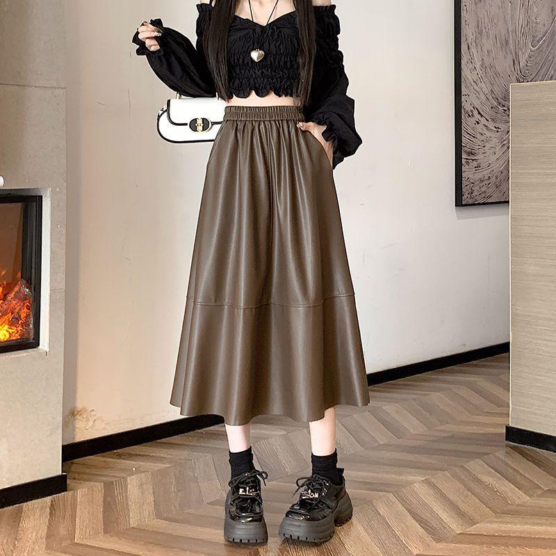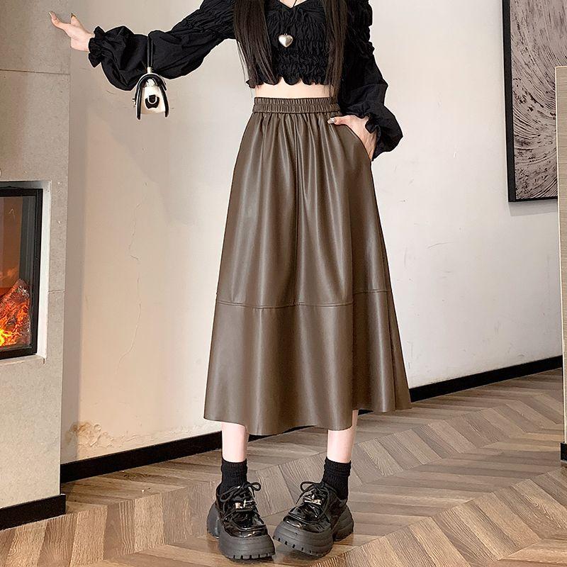 Юбка из искусственной кожи на осень и зиму, женская, темпераментная, повседневная, с большим зонтом, юбка с высокой талией, эластичная резинка на талии, юбка средней длины для женщин