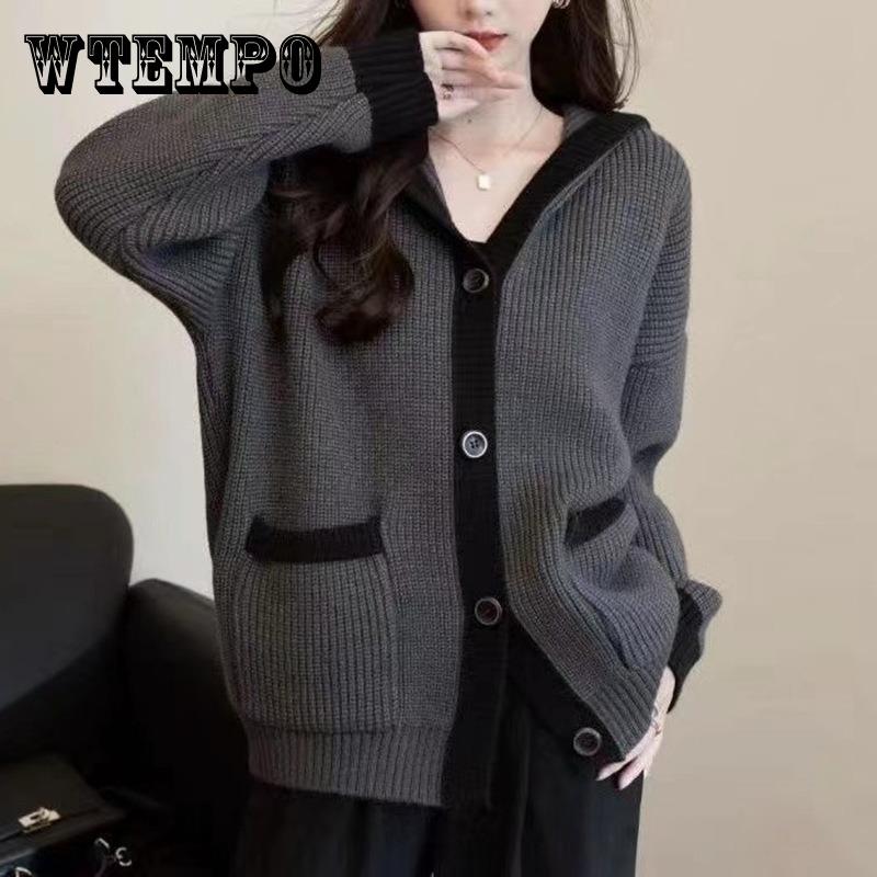 Свободный свитер с капюшоном в стиле колор-блок, женский вязаный кардиган, толстое пальто