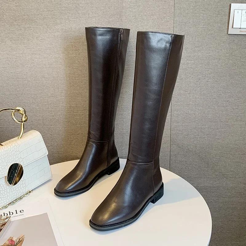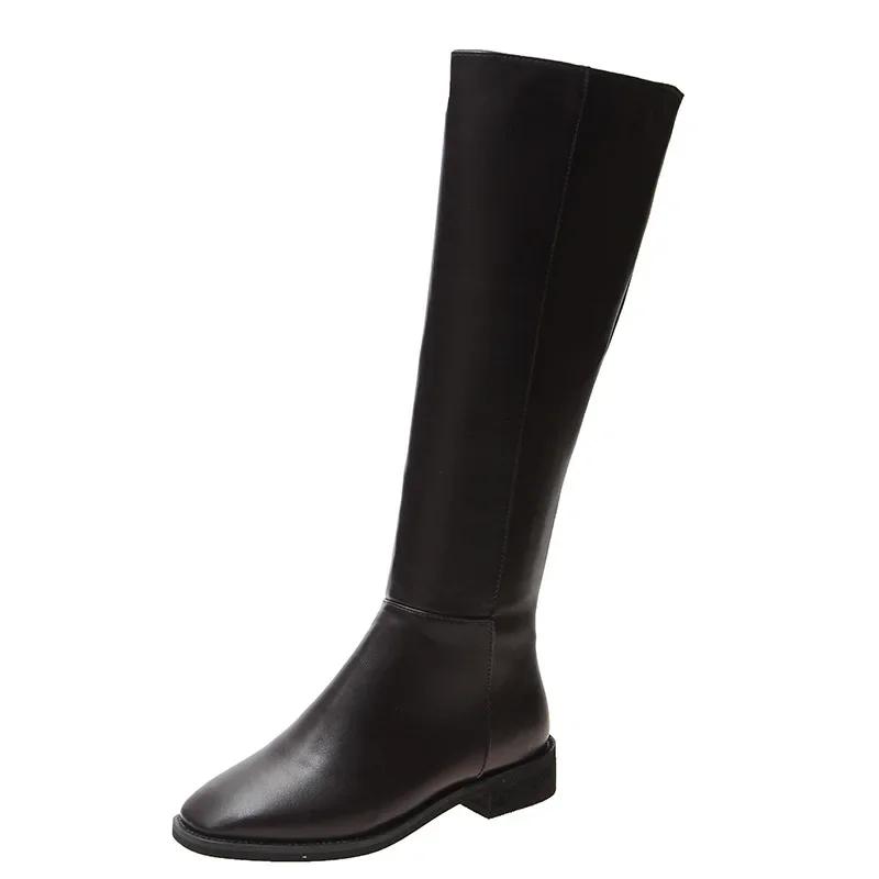 2024 новые зимние кожаные женские сапоги до колена мотоциклетные квадратные носки на молнии обувь на низком каблуке женские сапоги для верховой езды женские длинные сапоги99