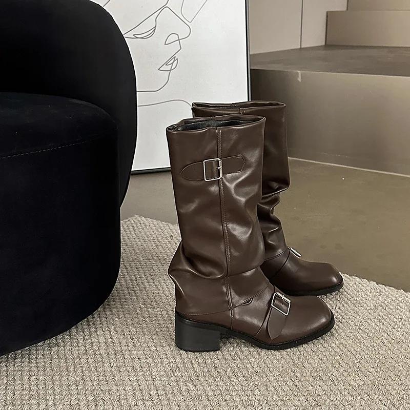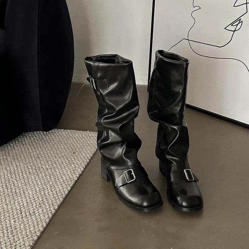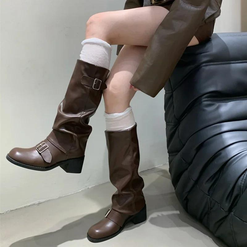 Мода Зимние женские сапоги в стиле панк до колена Модные длинные сапоги с пряжкой на поясе в рыцарском стиле Дизайнерские толстые каблуки Botas De Mujer
