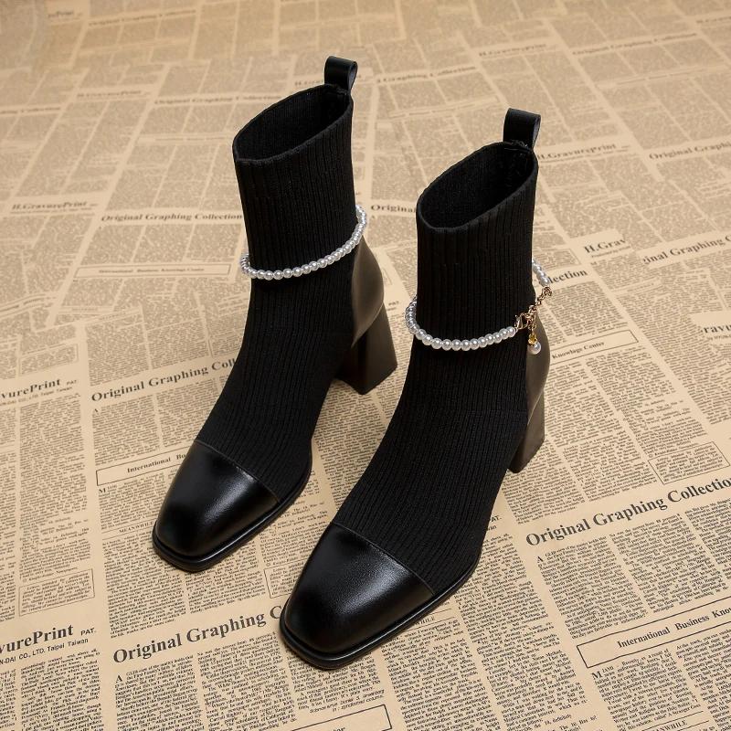 Мода Толстый каблук Женские ботильоны Модные туфли с жемчужным украшением в стиле ретро Осень-зима Квадратный носок Женские короткие ботильоны