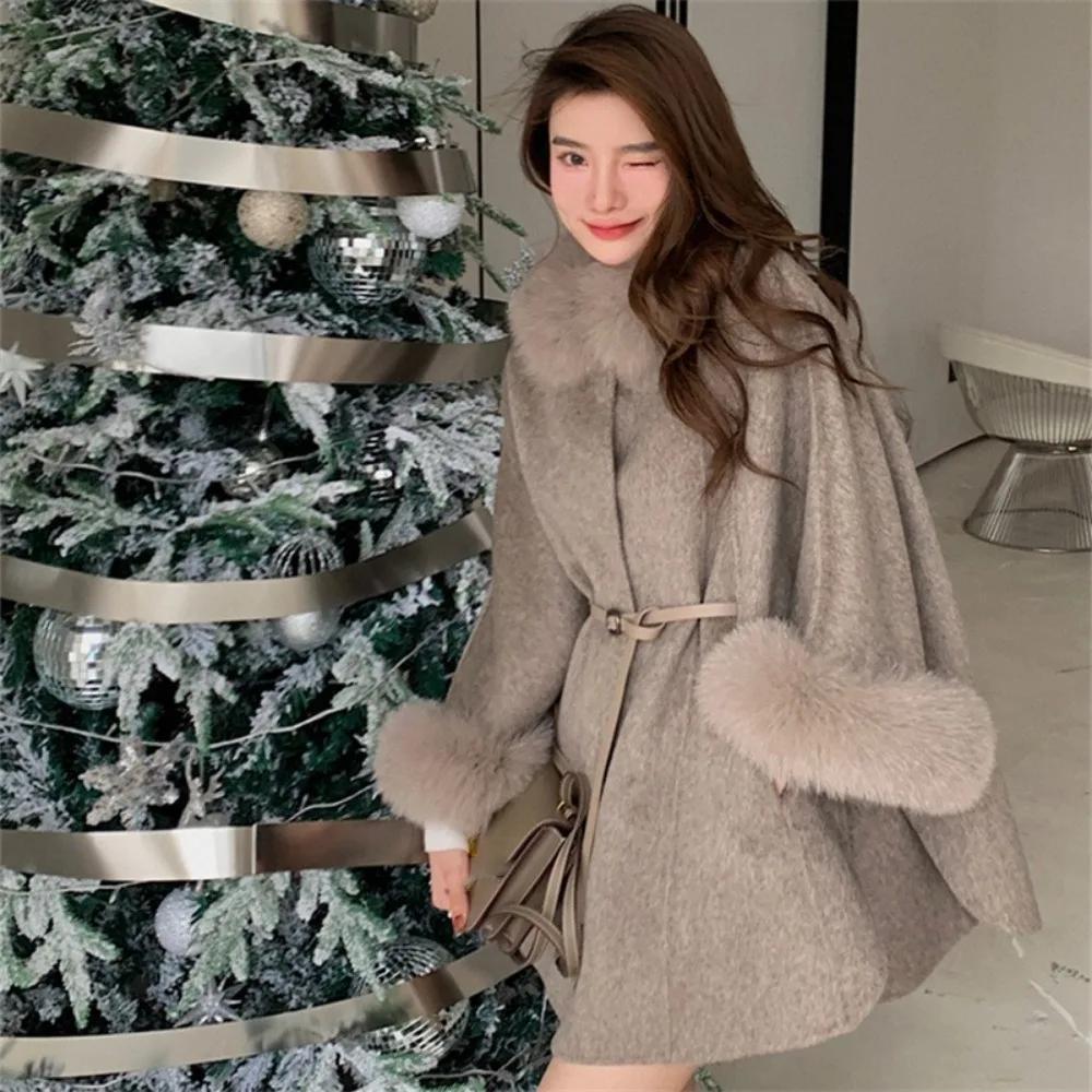 Двусторонняя накидка шерстяное шерстяное пальто осенне-зимнее воротник из искусственного меха лисы корейское пальто-шаль