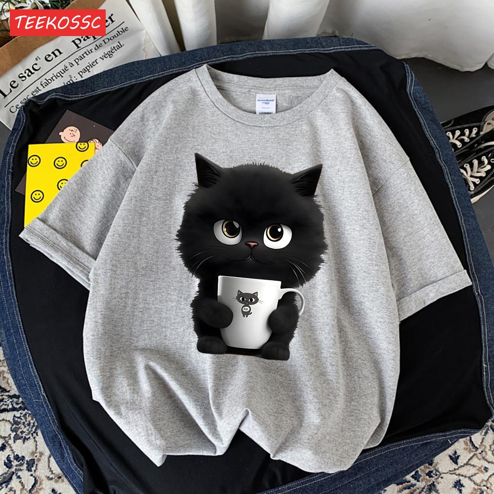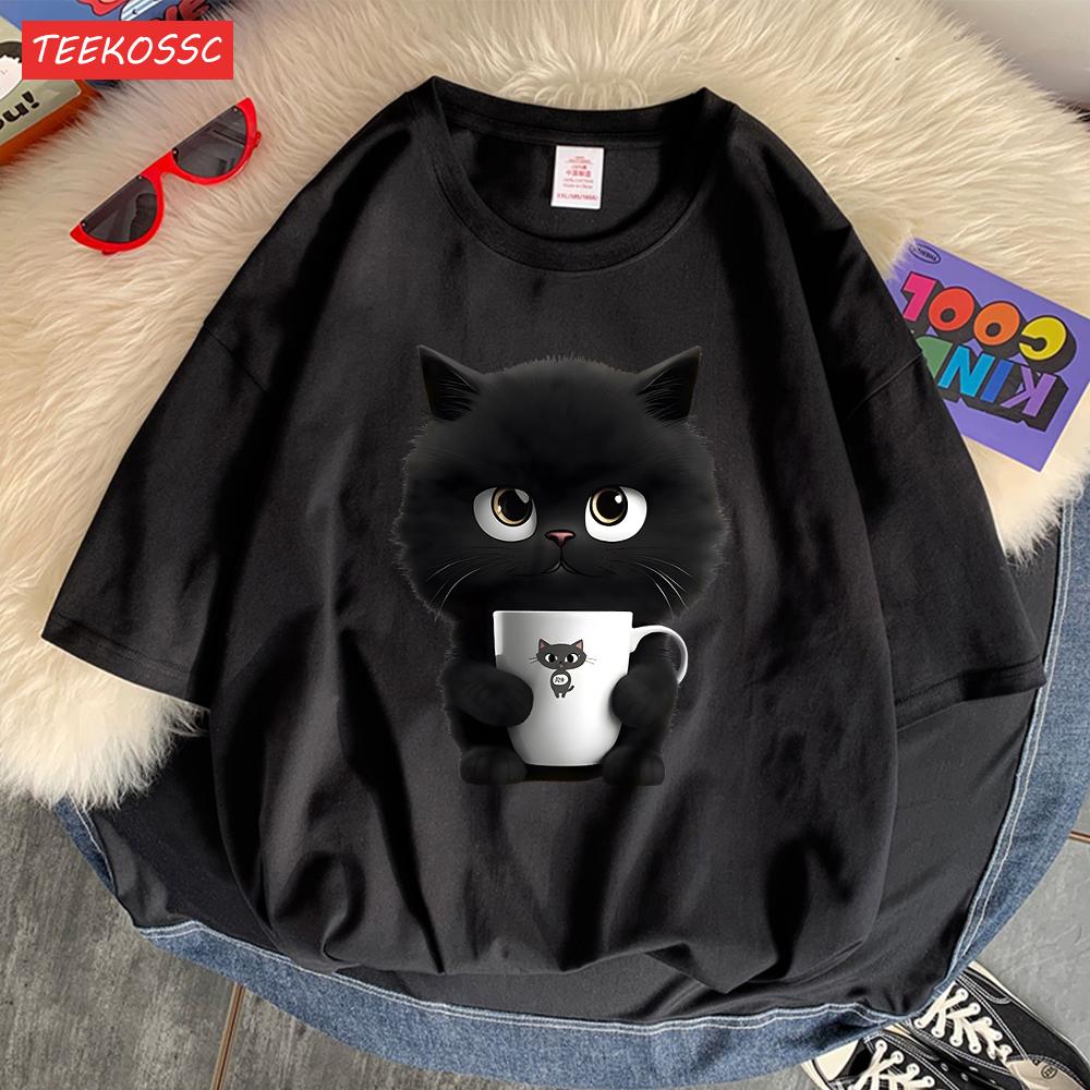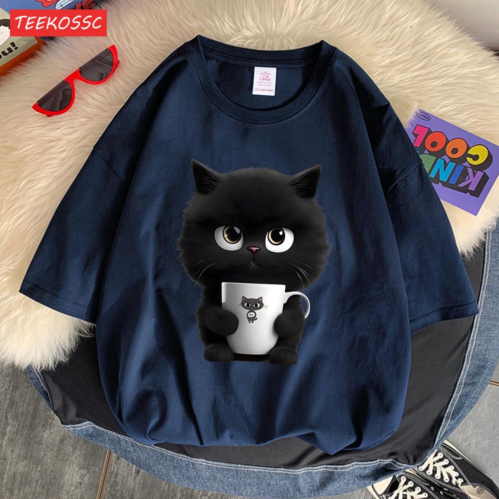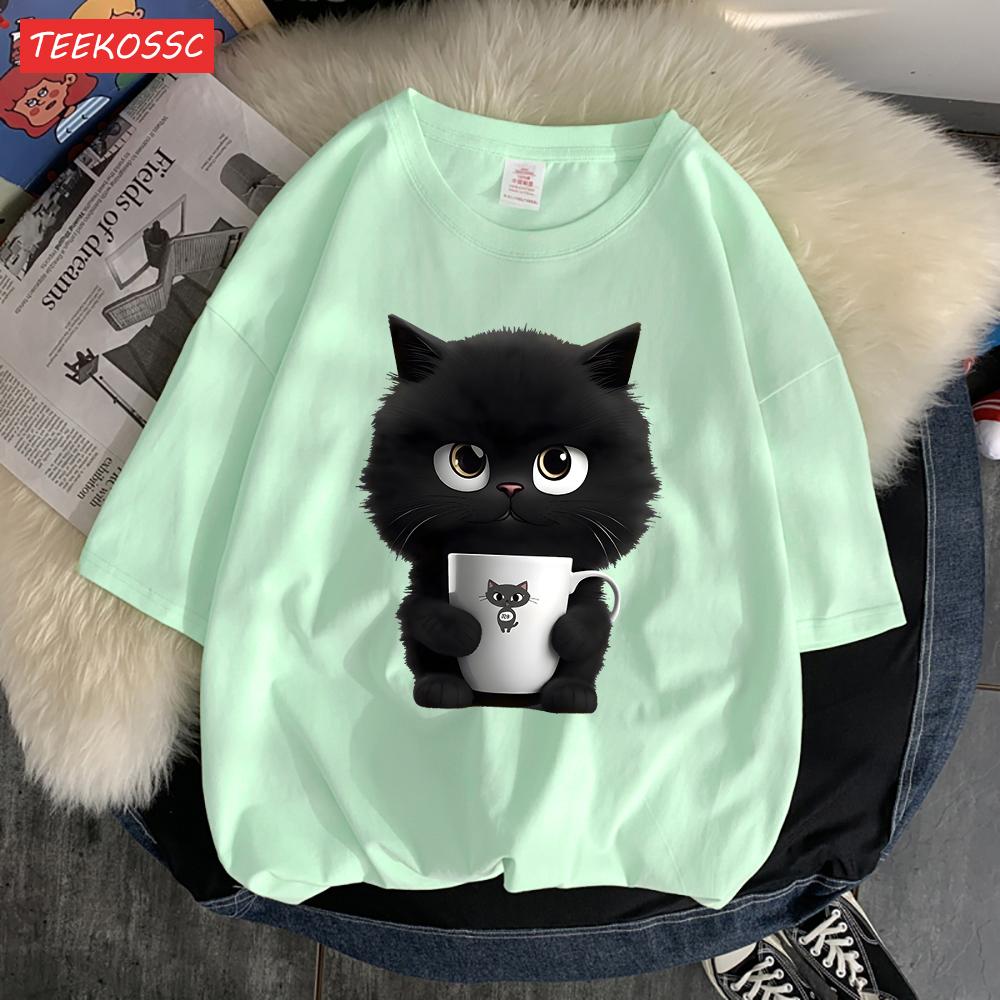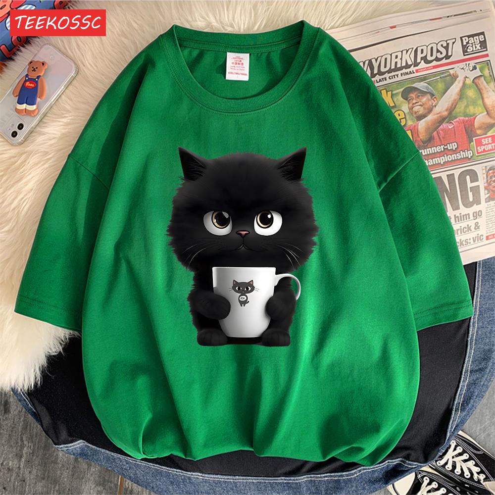 Футболка с принтом «Милый черный кот держит чашку», дышащая, приятная для кожи, с коротким рукавом, модная одежда в стиле Харадзюку, удобная мягкая футболка