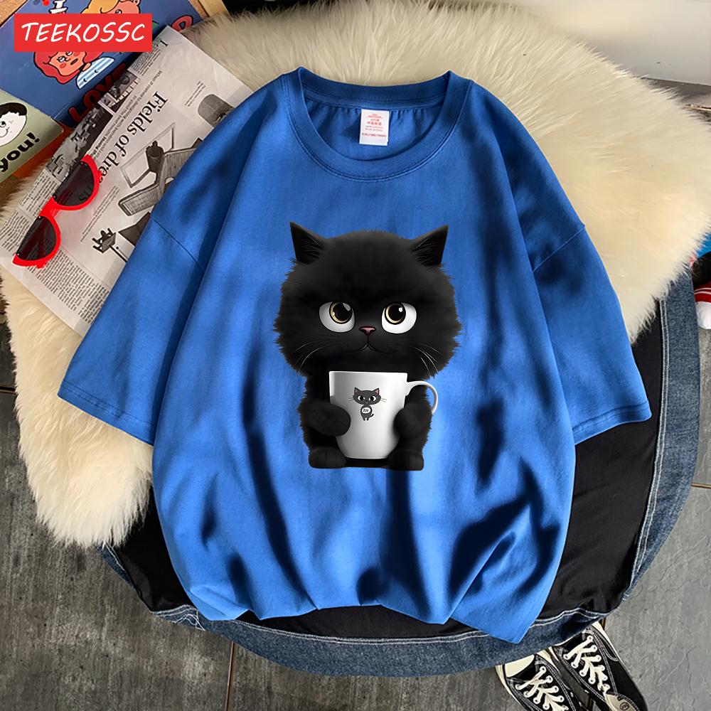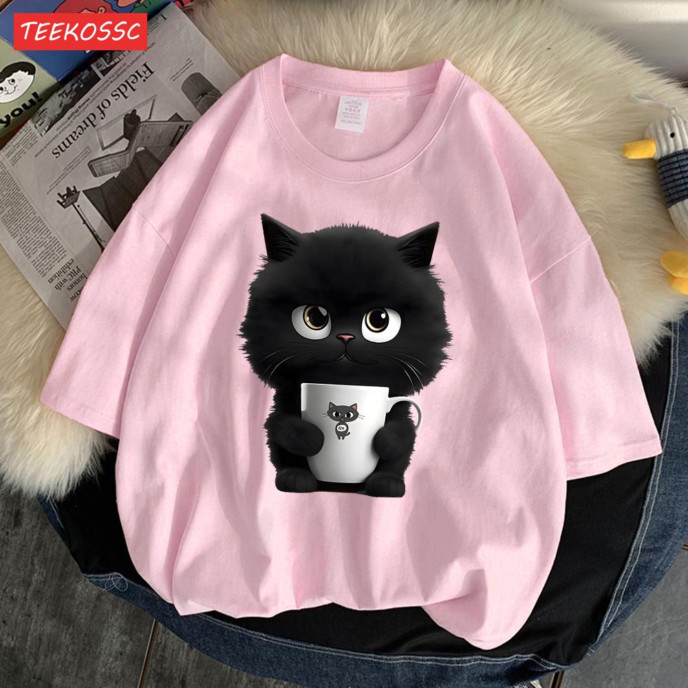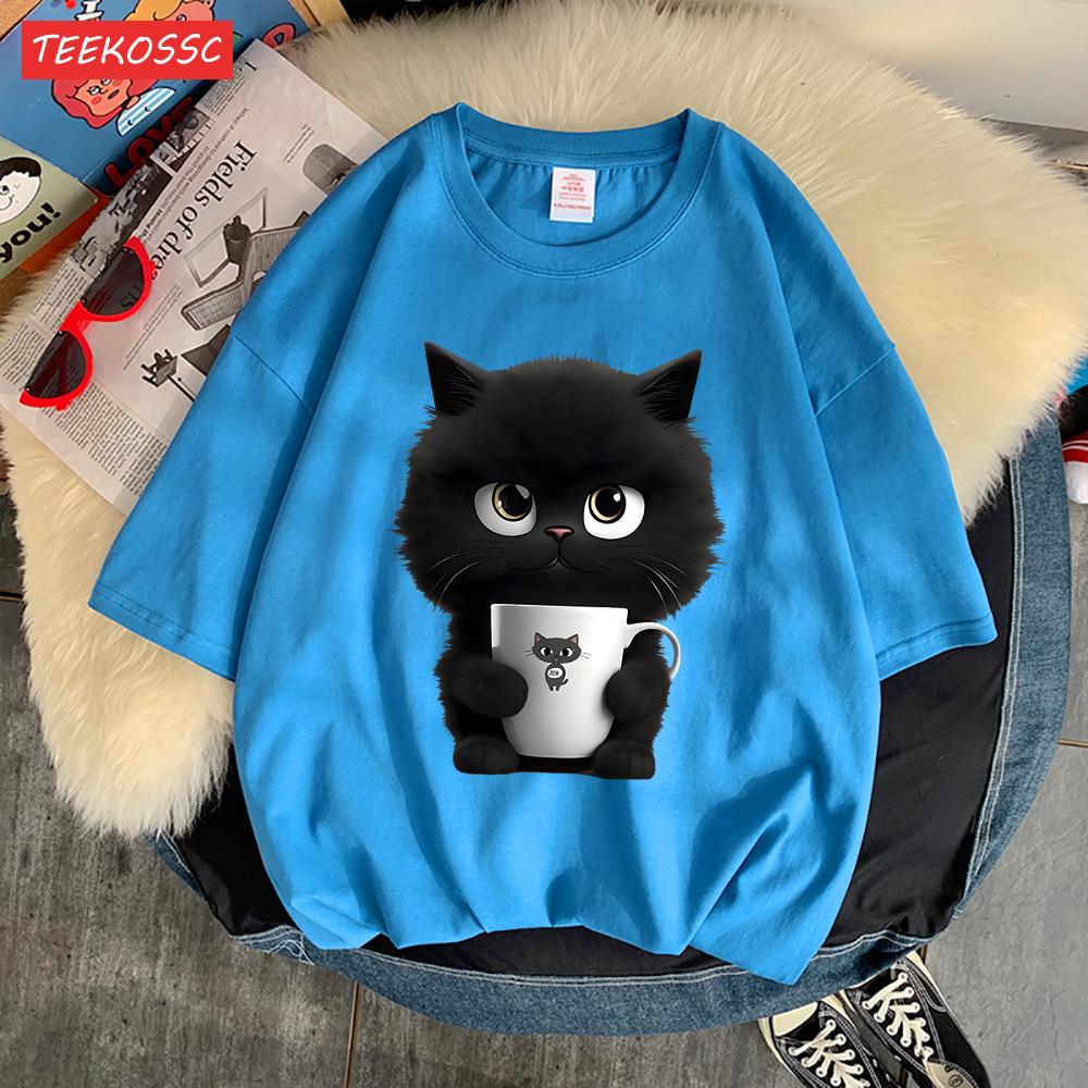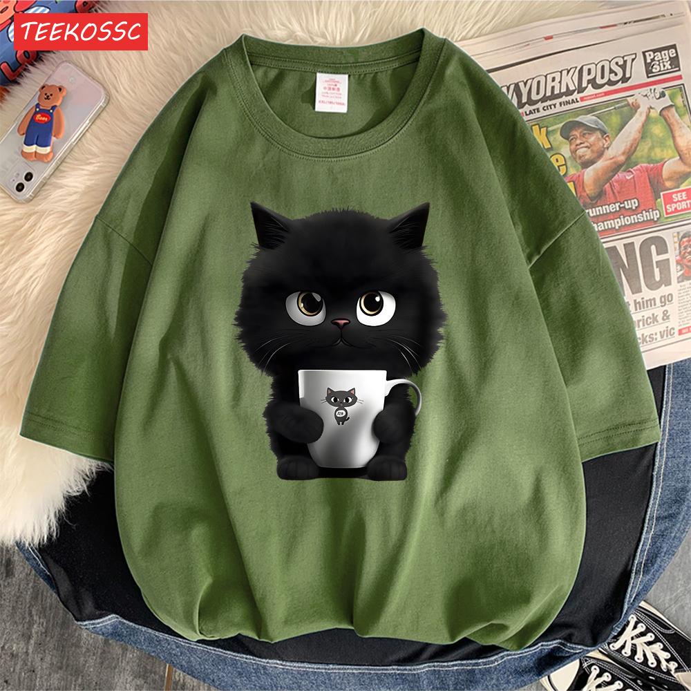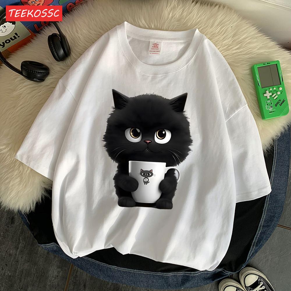 Футболка с принтом «Милый черный кот держит чашку», дышащая, приятная для кожи, с коротким рукавом, модная одежда в стиле Харадзюку, удобная мягкая футболка