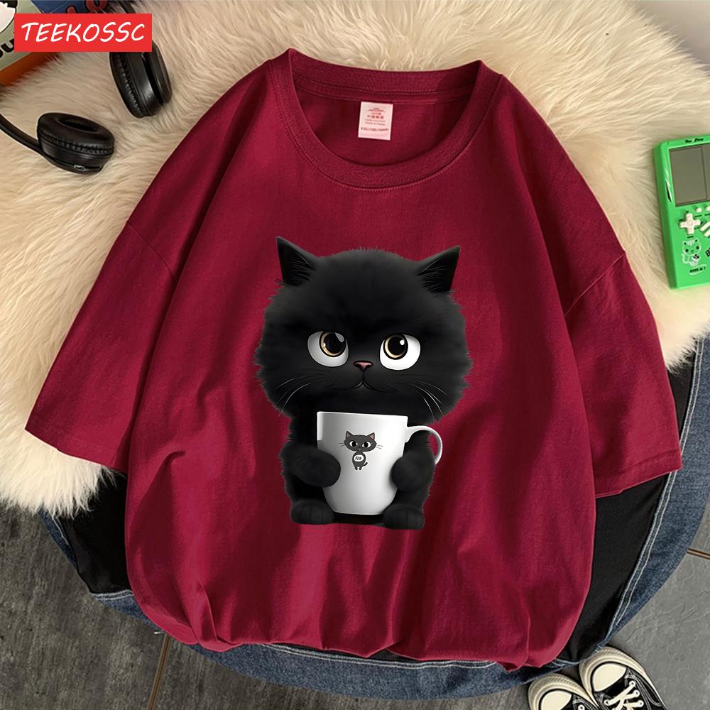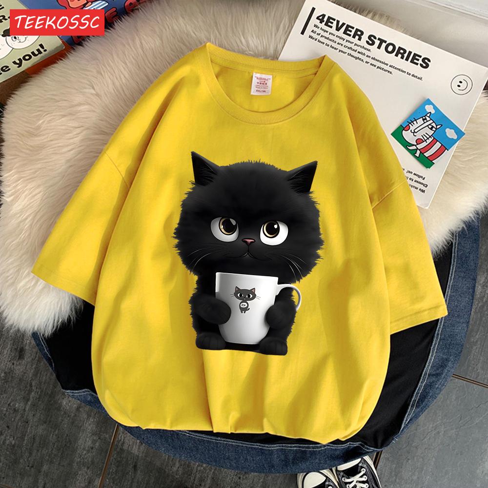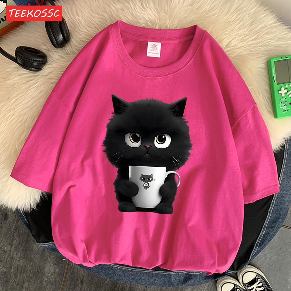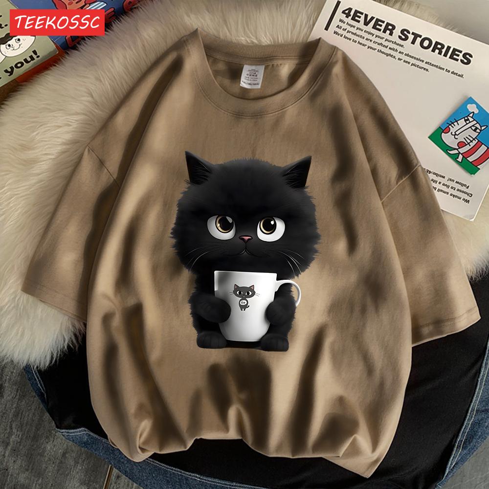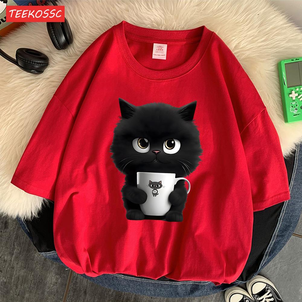 Футболка с принтом «Милый черный кот держит чашку», дышащая, приятная для кожи, с коротким рукавом, модная одежда в стиле Харадзюку, удобная мягкая футболка