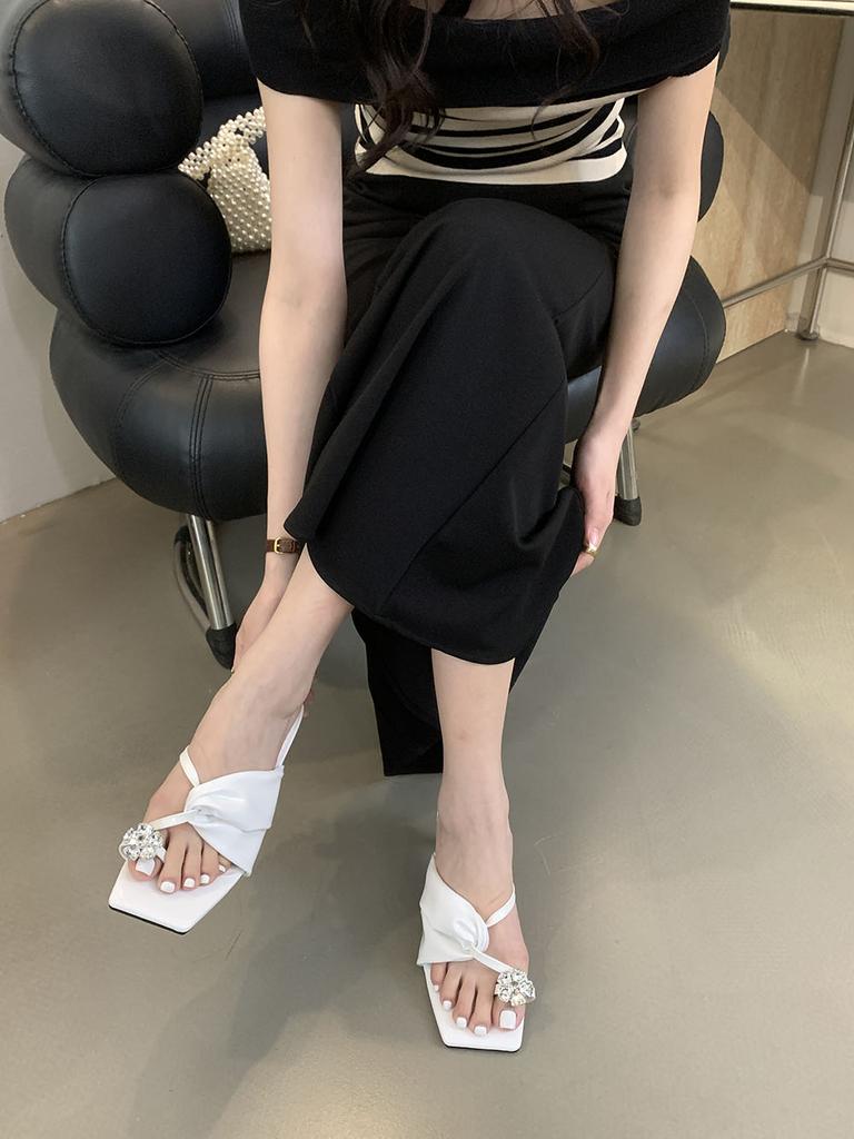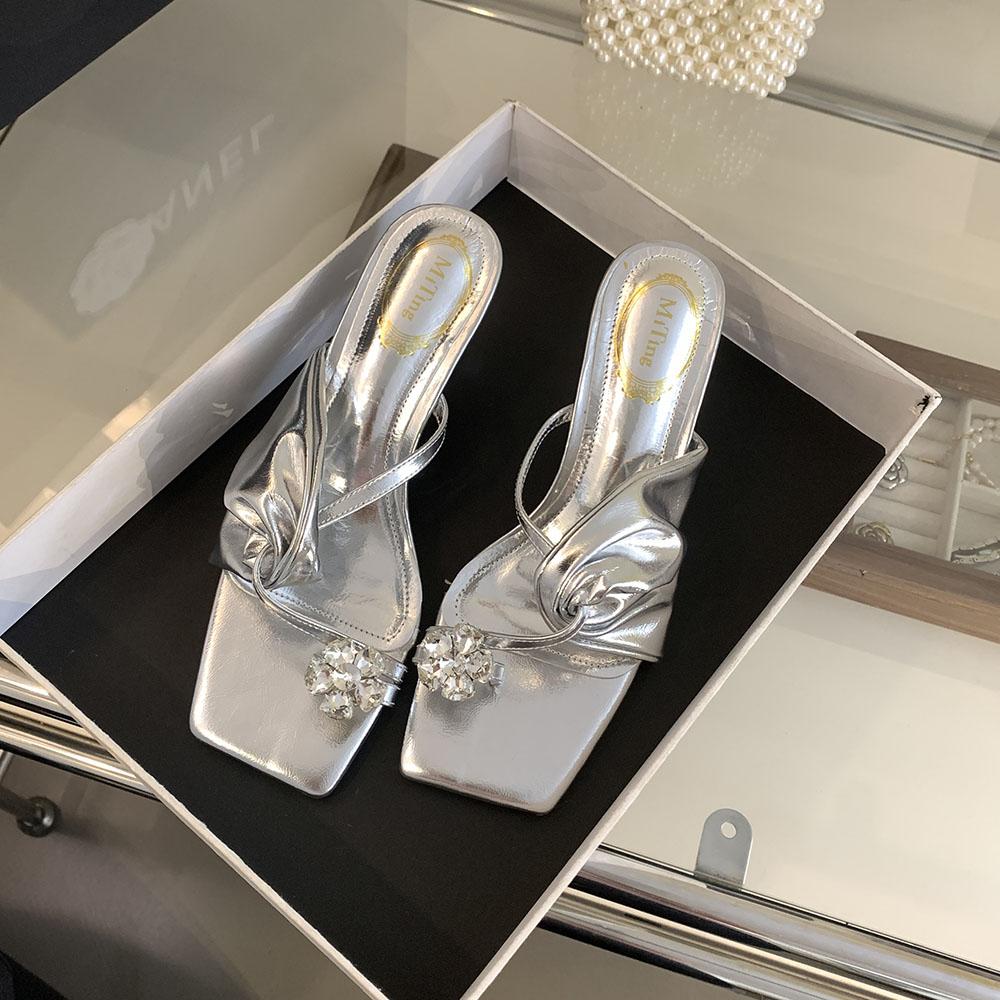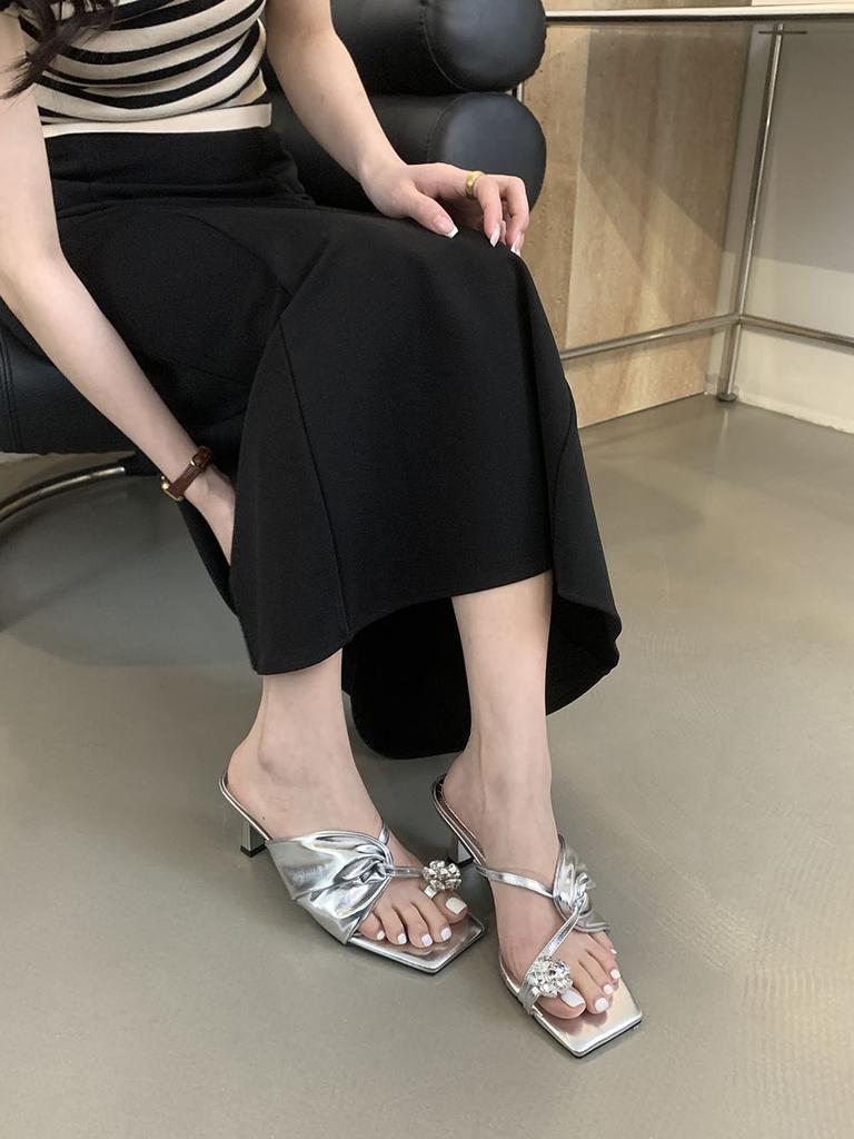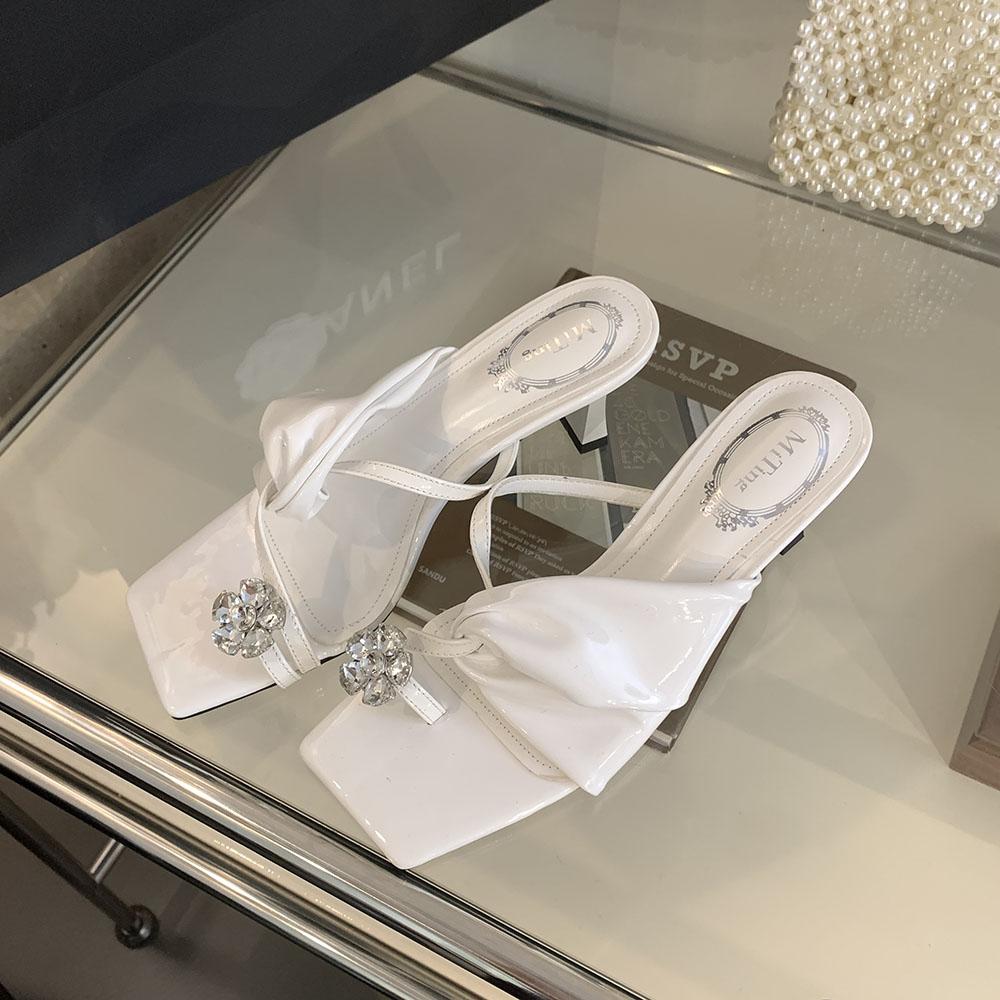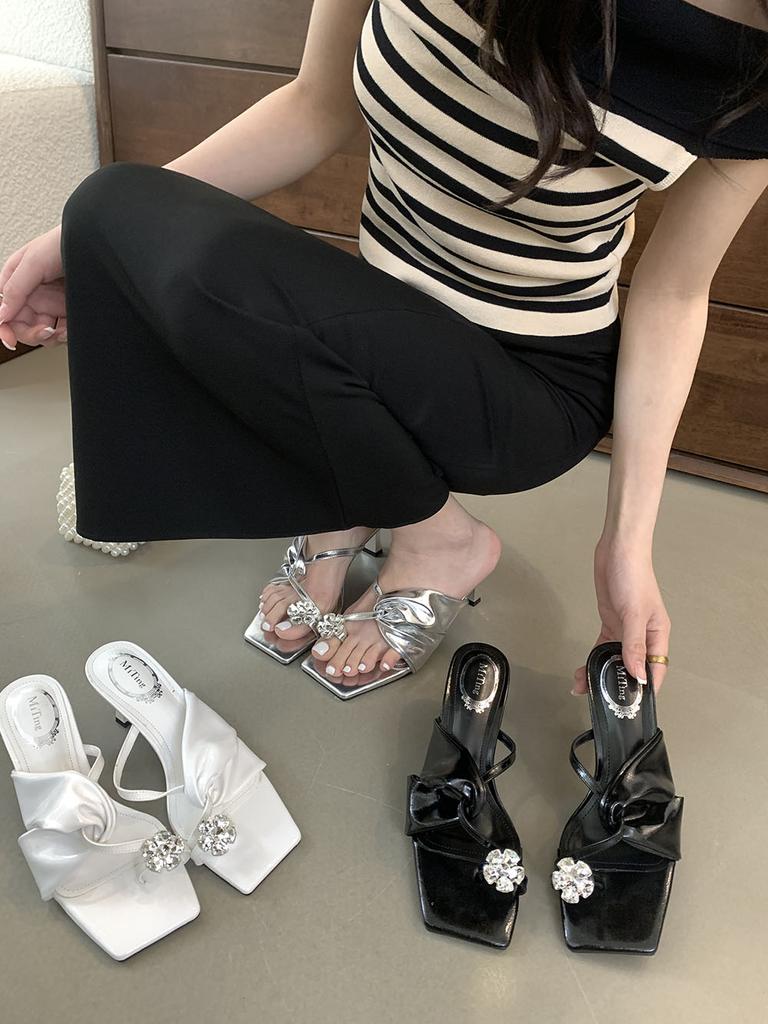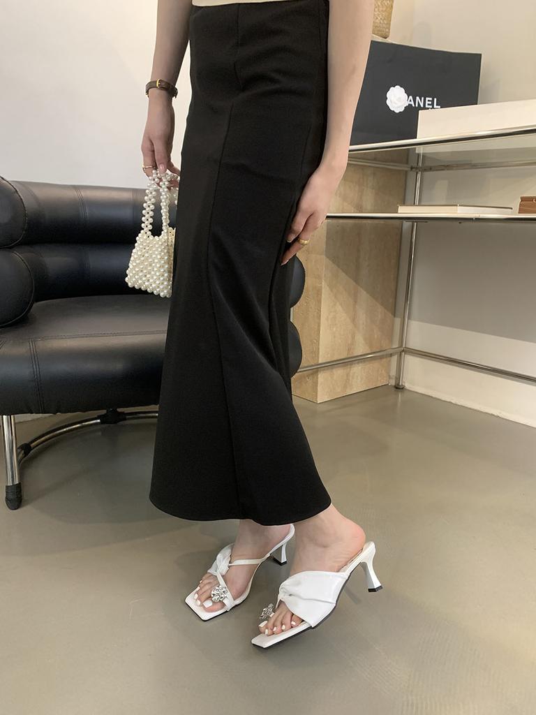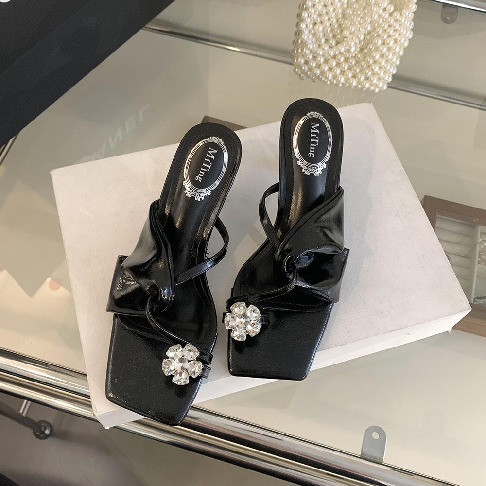Модные женские туфли с застежкой-носком, летние уличные туфли-мюли, туфли на тонком высоком каблуке, туфли-лодочки для вечеринок, повседневные туфли с черным золотом и белыми кристаллами и стразами