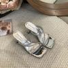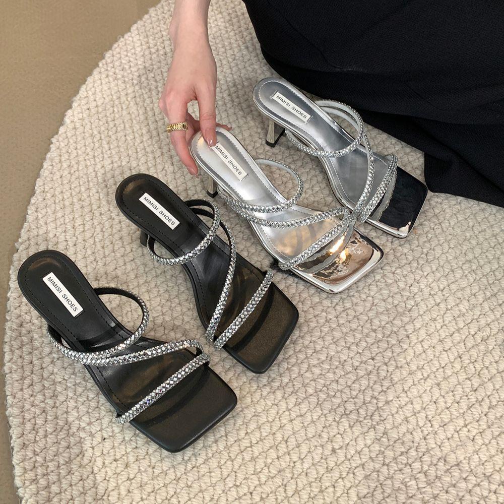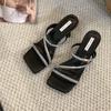 Мода Модные женские тапочки Летние уличные шлепанцы Тонкие высокие каблуки Стразы Цепочка Повседневные мюли Обувь Женские Размеры 35-39 Платье Шлепанцы