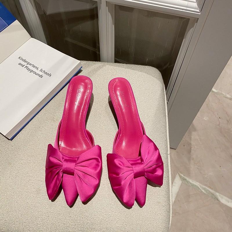 Мода Модные женские тапочки на тонком низком каблуке Черные розовые красные туфли с острым носком Большой бант Дизайн Летняя пляжная обувь Элегантные мюли