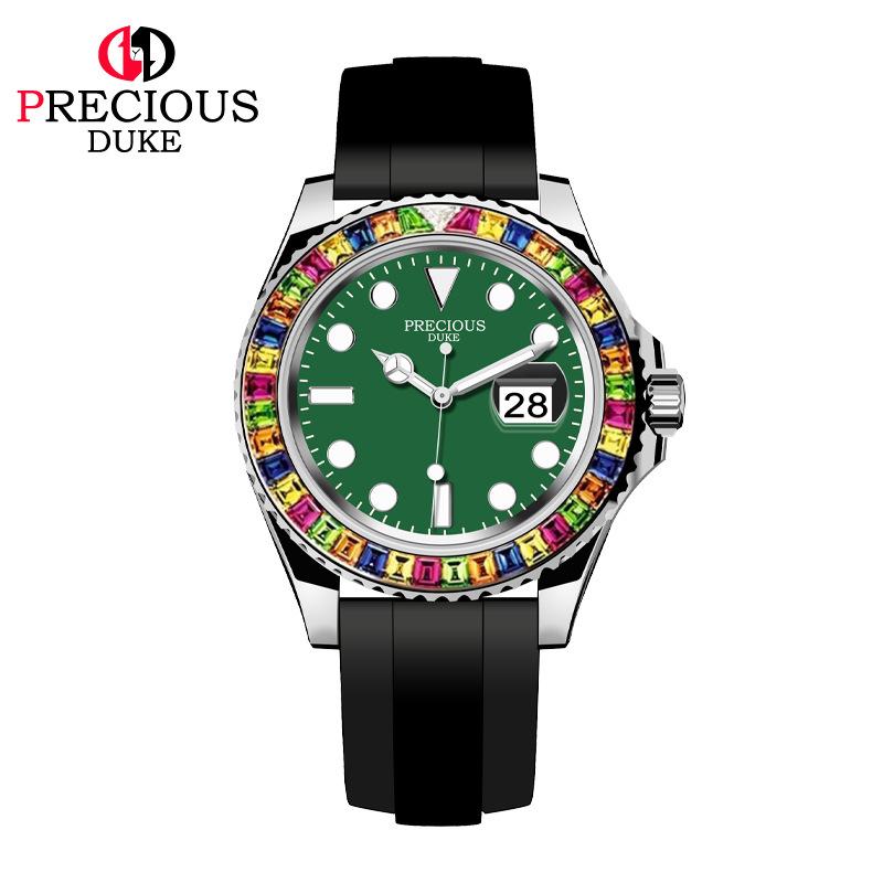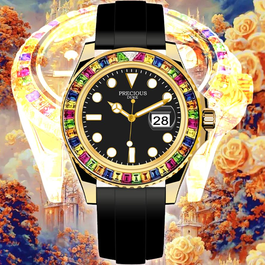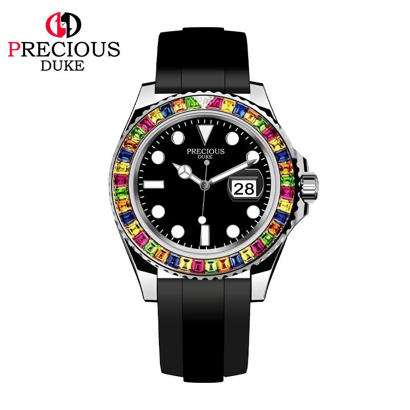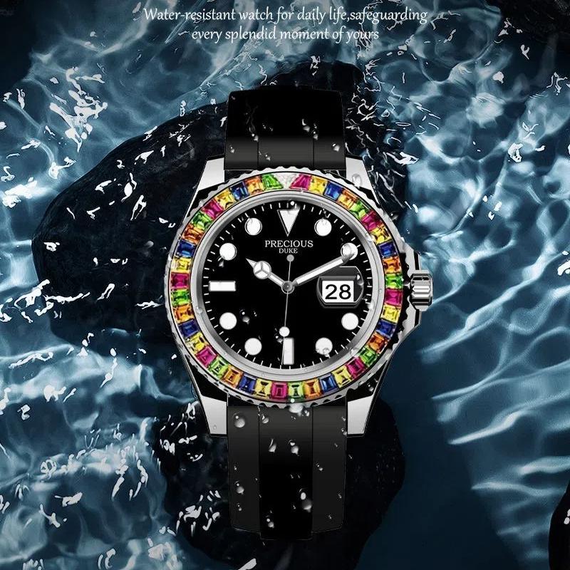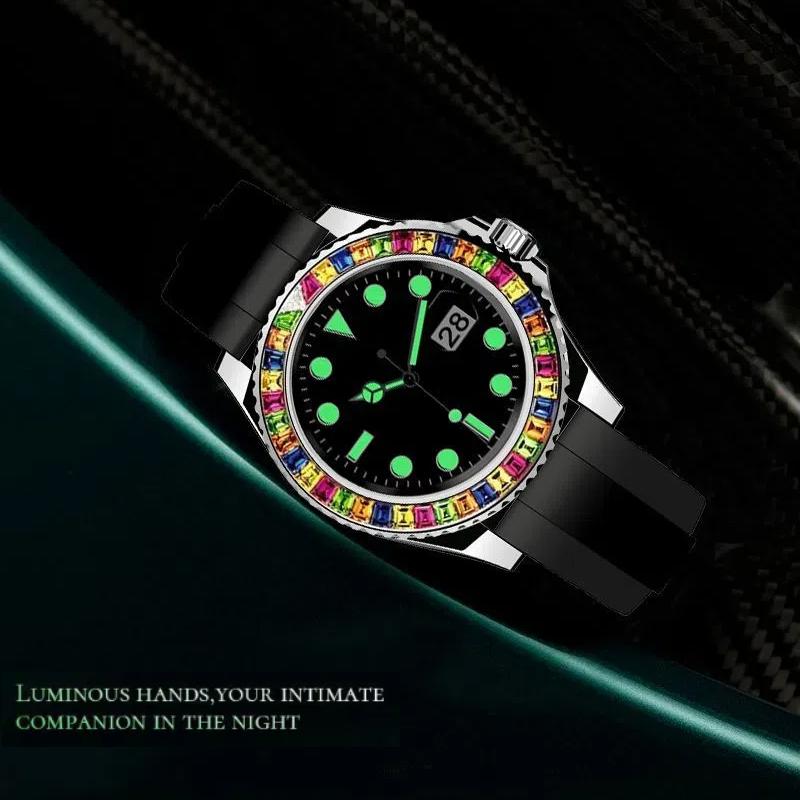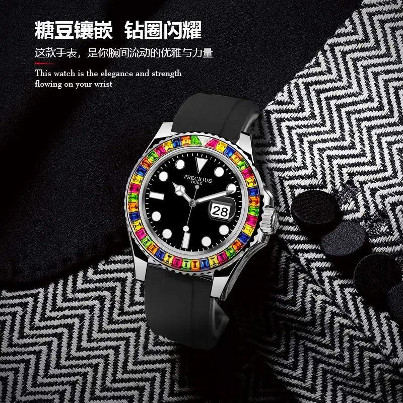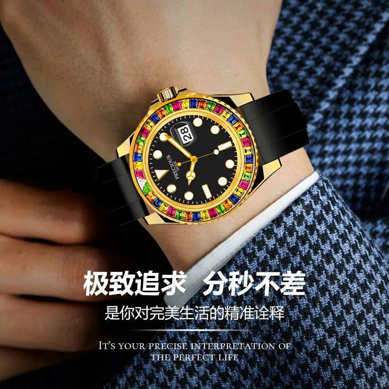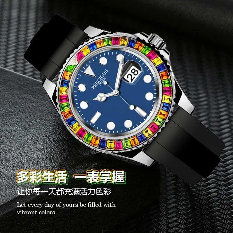 ※Мужские кварцевые наручные часы с вращающимся безелем, инкрустированным цветными циркониевыми бриллиантами, и окошком календаря.