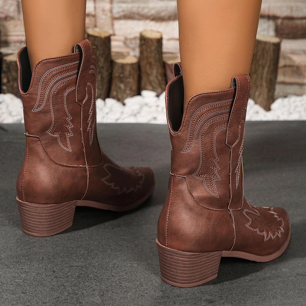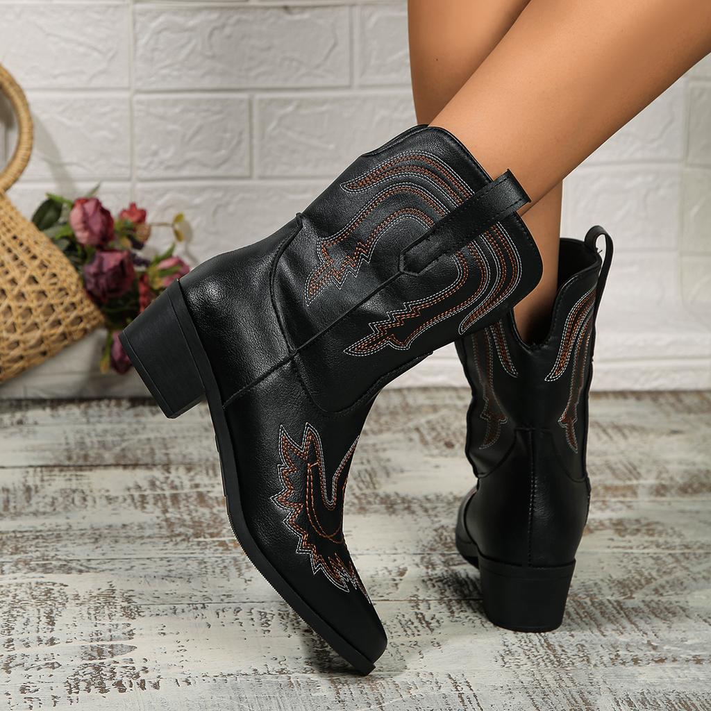Модные женские ботильоны с вышивкой в стиле ретро с V-образным вырезом и острым носком на толстом каблуке в стиле вестерн женские ботинки из искусственной кожи без застежек в ковбойском стиле Botas Mujer