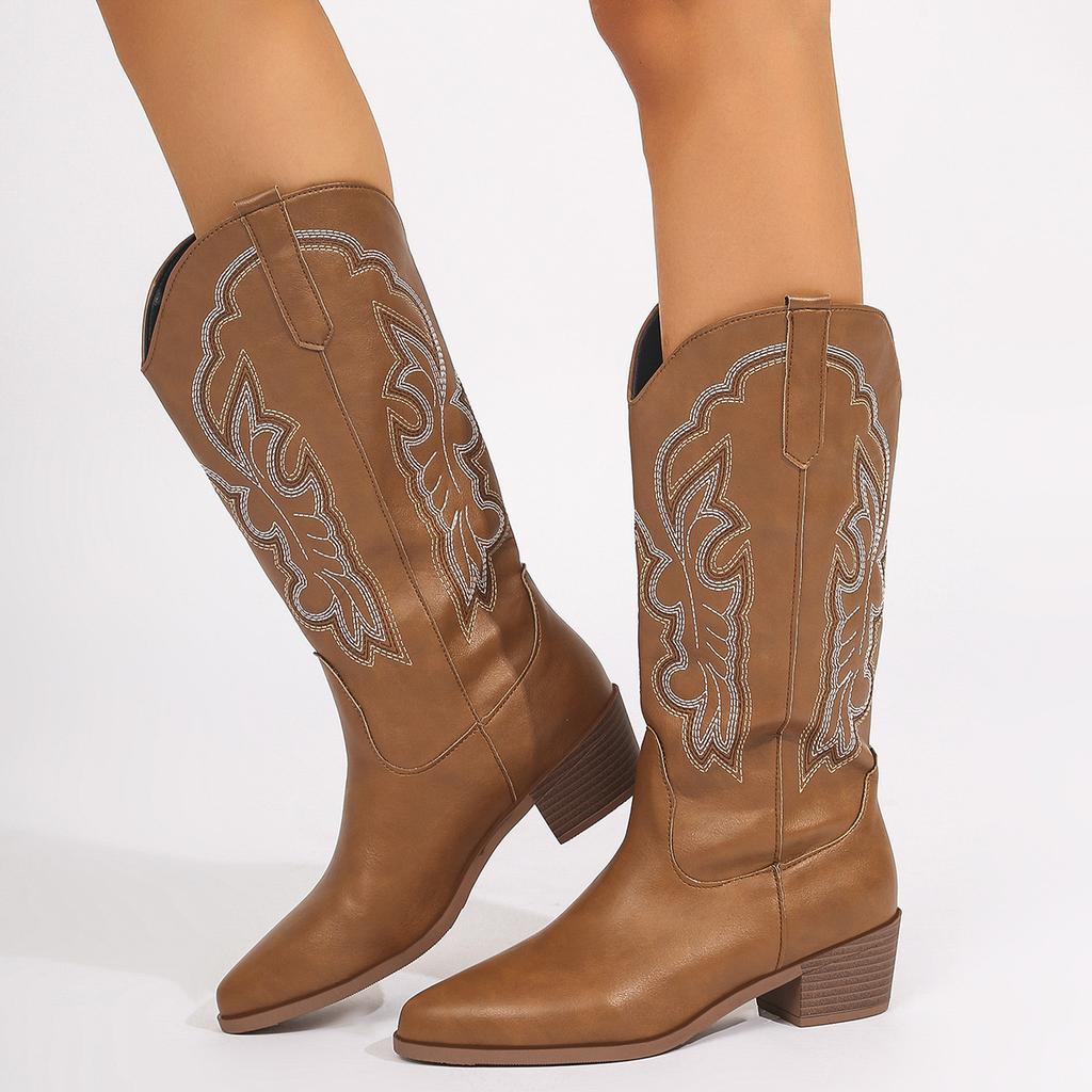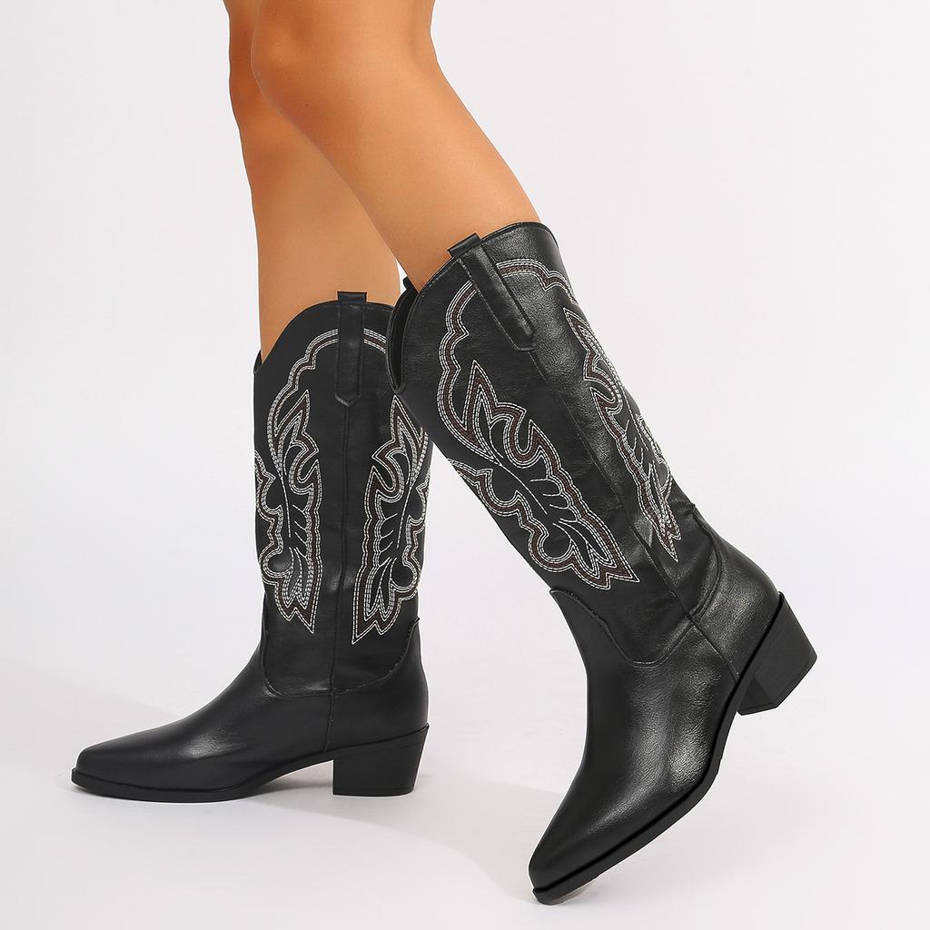 Модные вышитые ковбойские сапоги для женщин, осенние сапоги с острым носком и толстым каблуком, высокие сапоги до колена, женские свободные длинные сапоги из искусственной кожи