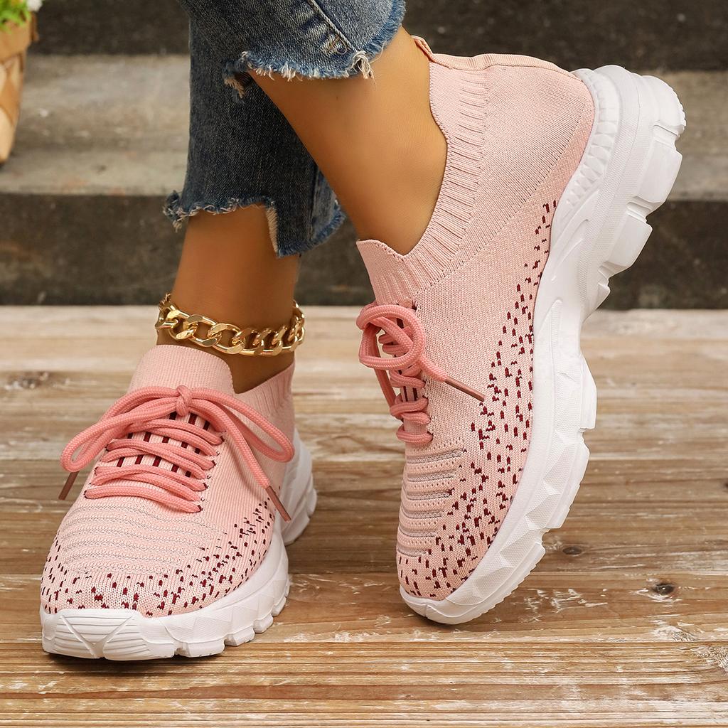 Модные розовые вязаные кроссовки на платформе для женщин 2024 года, весенние сетчатые дышащие спортивные туфли для женщин, нескользящие кроссовки на толстой подошве для бега