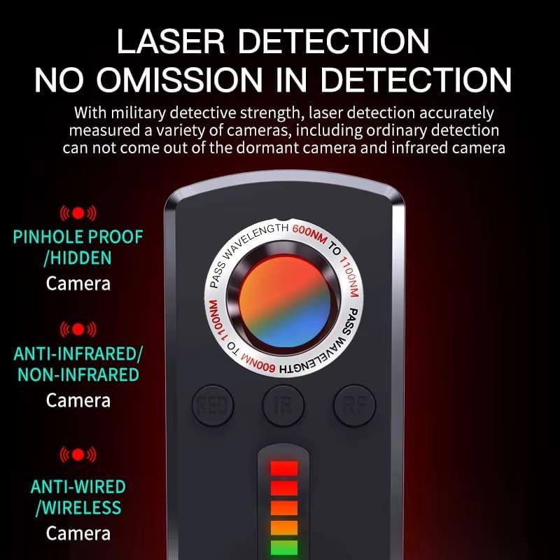 Благодаря яркому красному светодиодному лазеру и специальному оптическому фильтру вы можете визуально определить, есть ли в окружающей среде камера, а также использовать физические свойства оптической линзы камеры, выполненной из стеклянного материала, для отражения света и определения местоположения камеры.