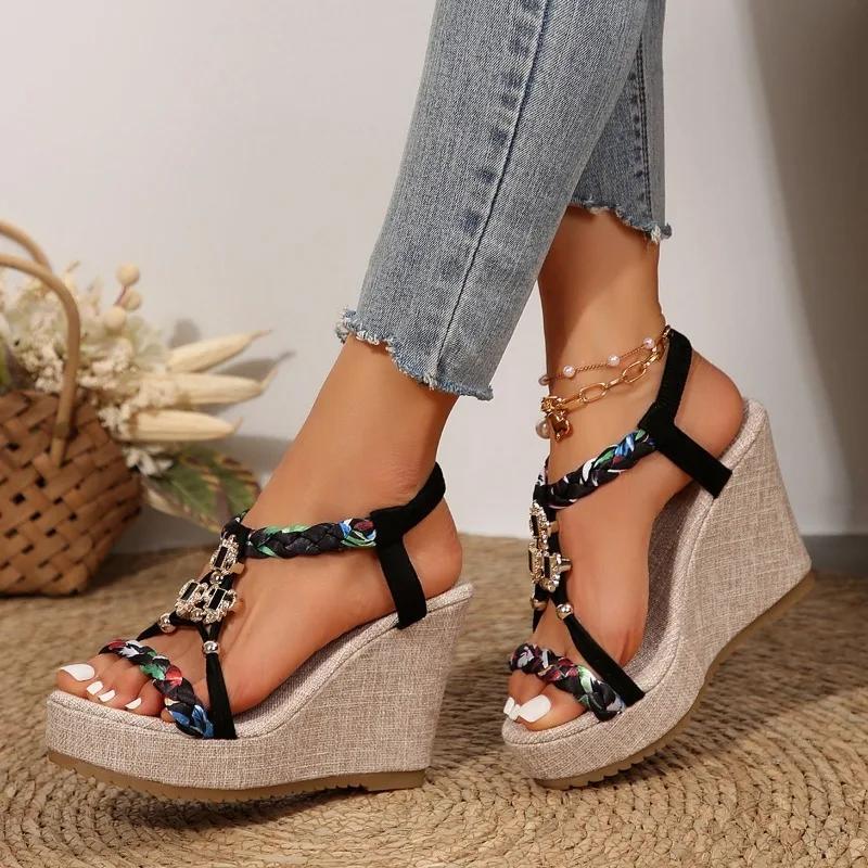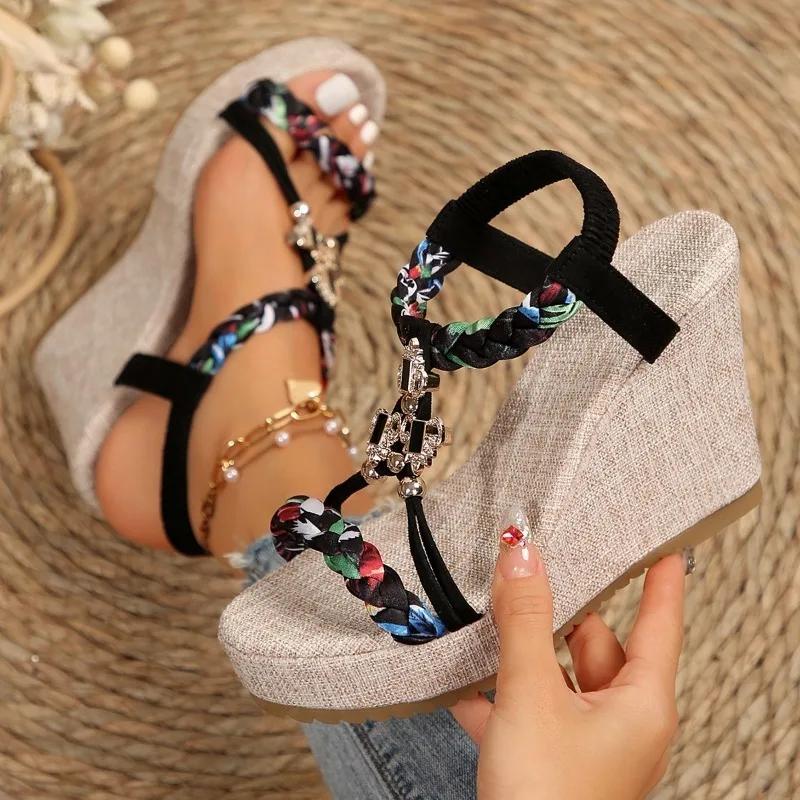 Распродажа модной женской обуви 2024 года, высококачественные женские сандалии с эластичной резинкой, летние сандалии с открытым носком, разноцветные босоножки на платформе и танкетке большого размера