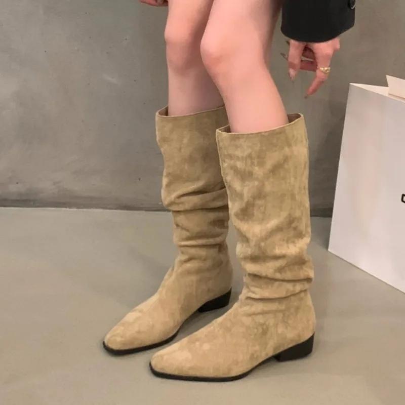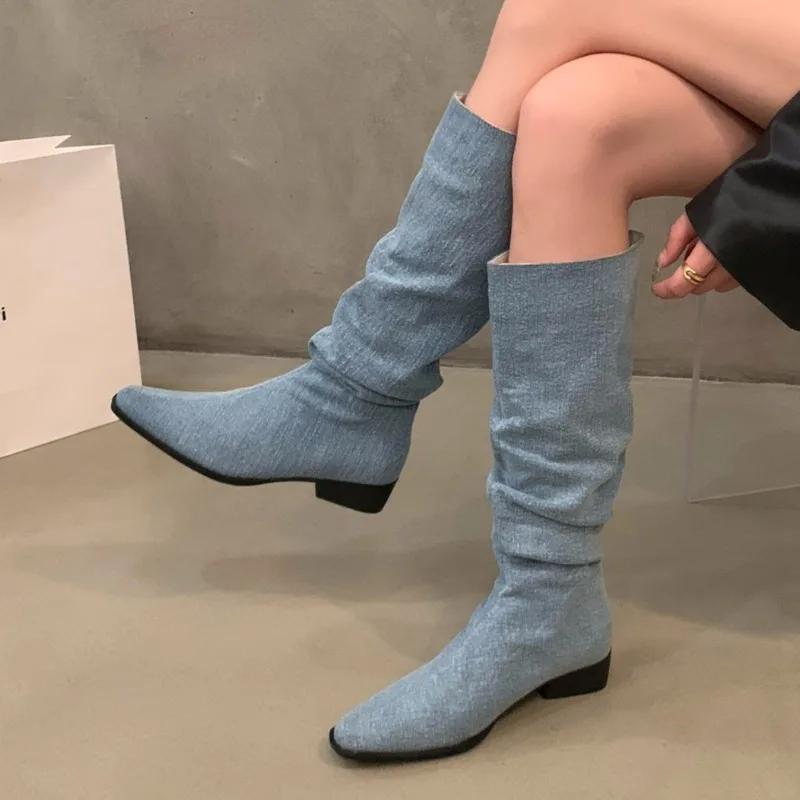 Мода Женская обувь 2024 Модные женские сапоги с рукавами Осень-зима Острый носок Джинсовые однотонные высокие сапоги на толстом каблуке Zapatos Mujer