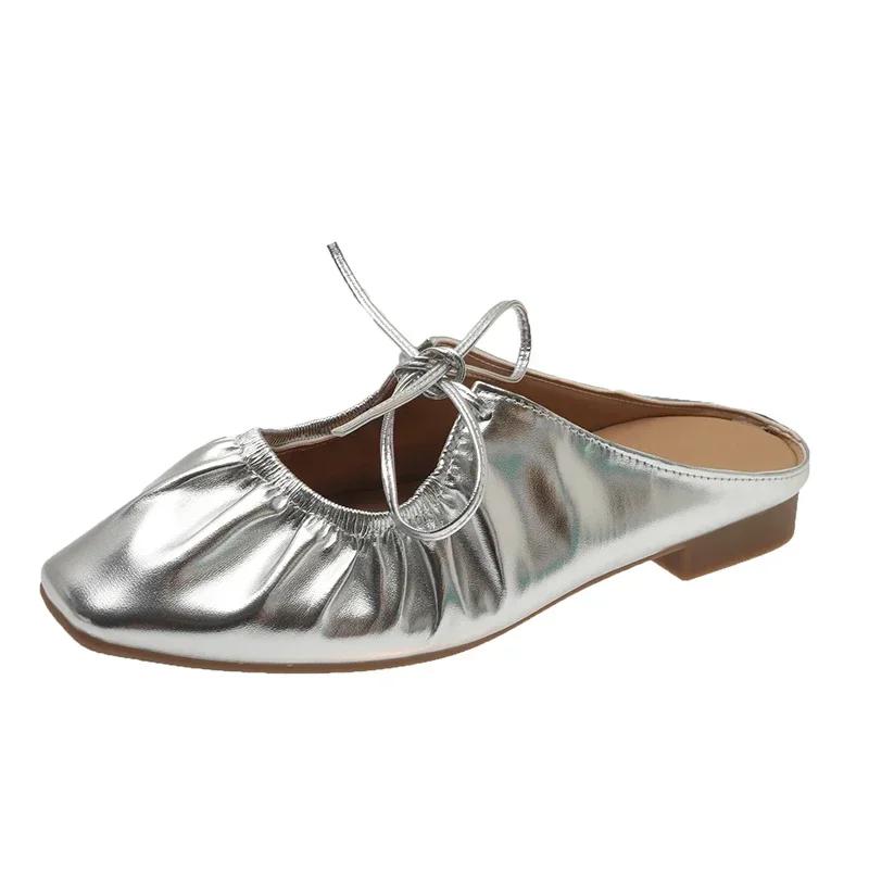 Мода 2024 года, новые брендовые туфли для женщин, женские тапочки с перекрестными шнурками, модные повседневные тапочки с закрытым носком, женские тапочки на плоской подошве с квадратным каблуком
