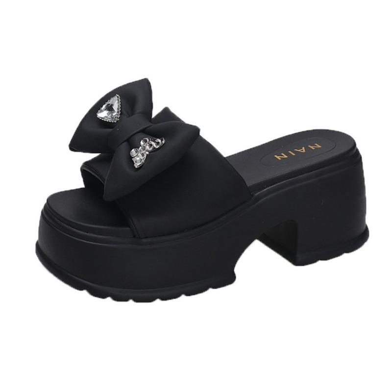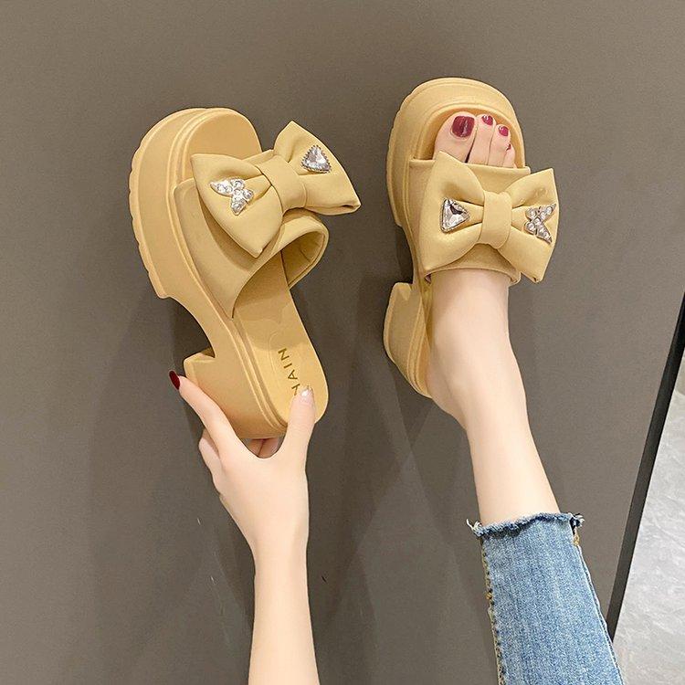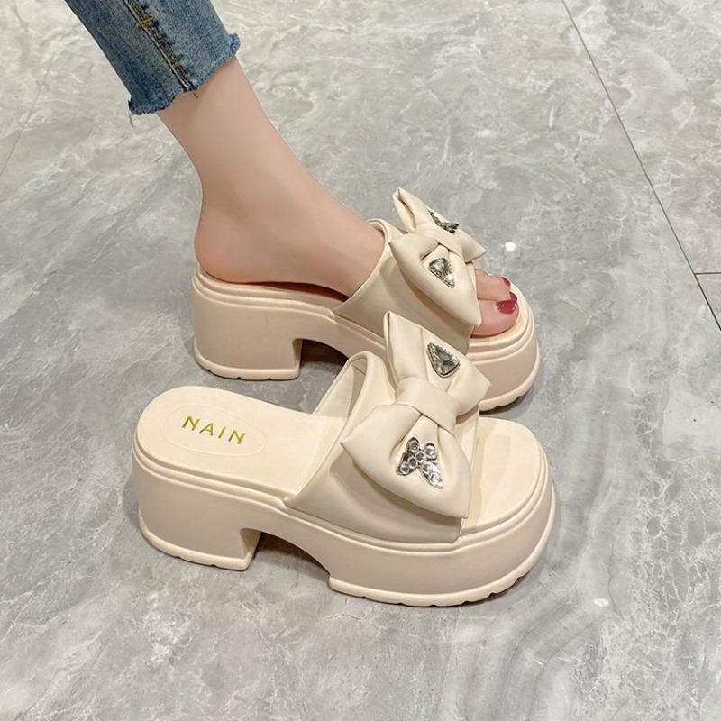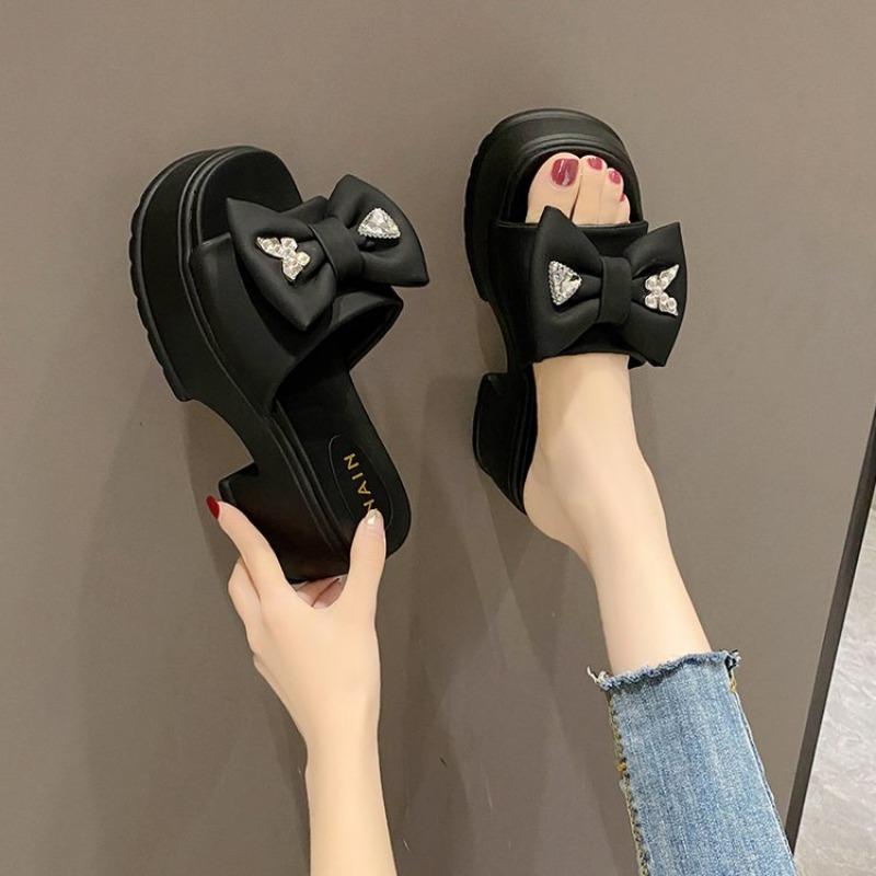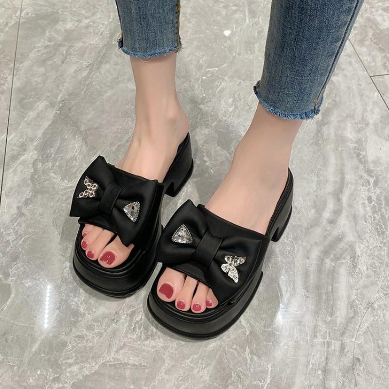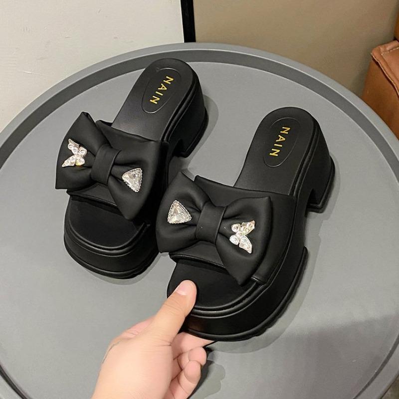 Модные новые тапочки Matsu Cake, женские тапочки на толстой подошве, лето 2024 года, модные сандалии-тапочки с бантом и бриллиантами, женская роскошь