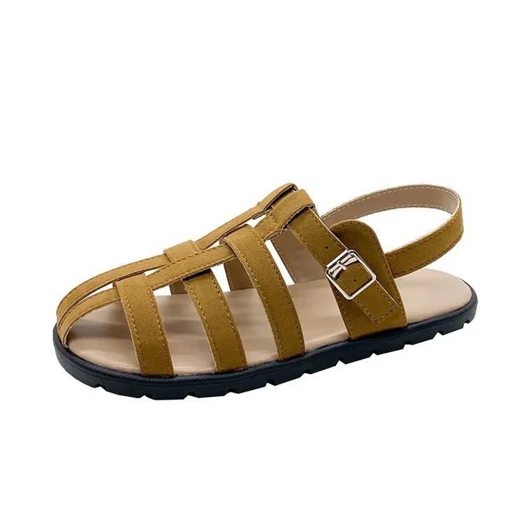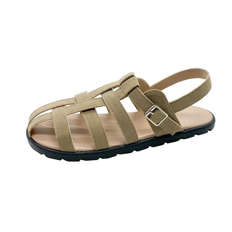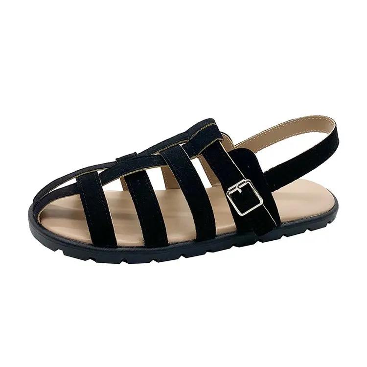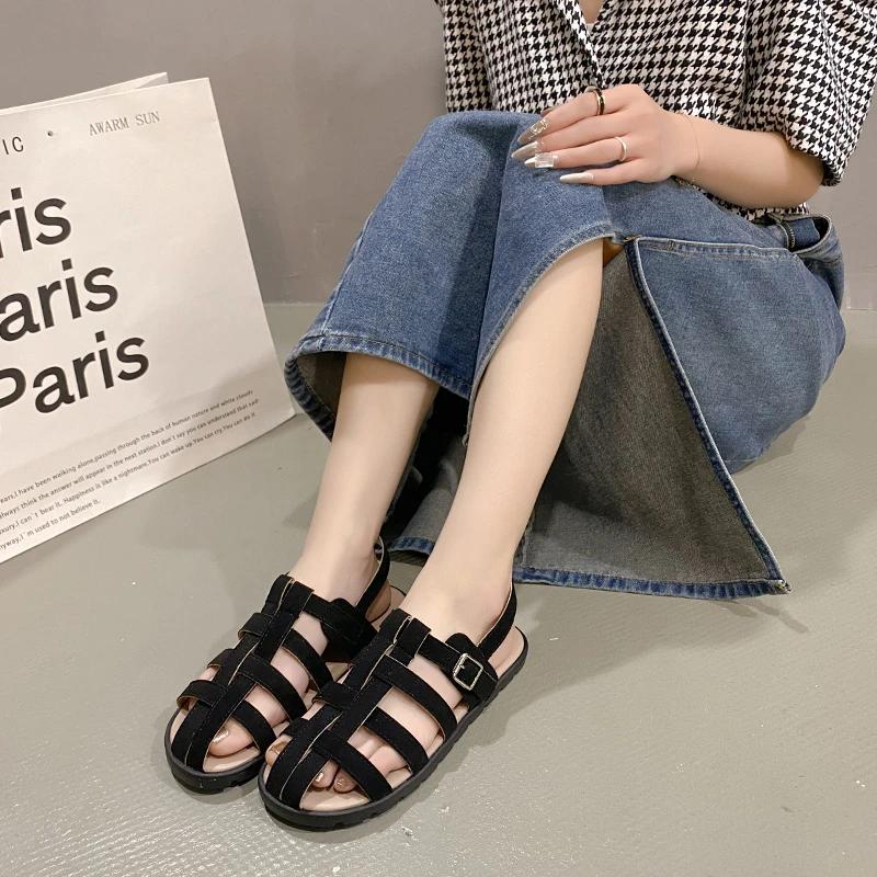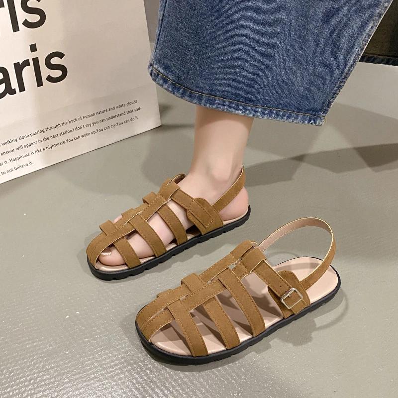 Мода 2024 года, мягкие низкие сандалии, женские кожаные туфли, летний костюм, женский бежевый, на низком каблуке, плоский, бархатный, удобный, черный, модный, закрытый, ретро, для женщин