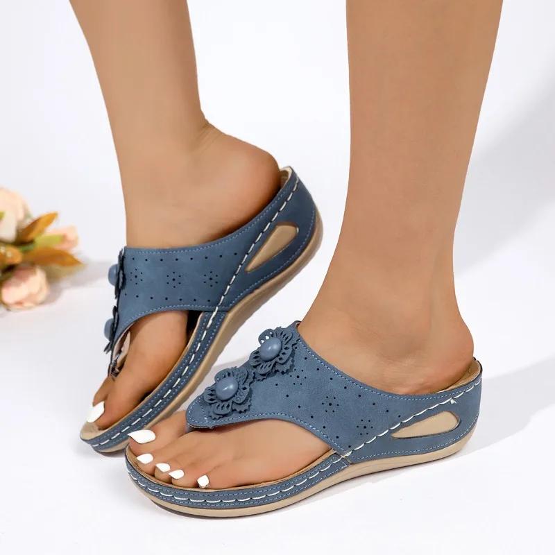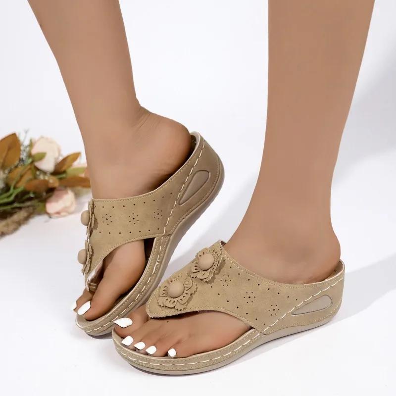 Модные летние хиты продаж, однотонные женские тапочки-стринги, большие размеры, повседневные женские тапочки с цветочным узором на танкетке в римском стиле