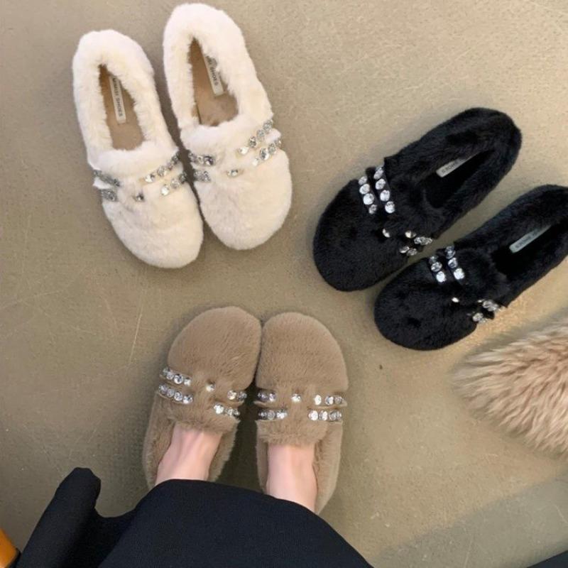 Модные роскошные меховые мокасины с крупными бусинами и кристаллами, женские зимние элегантные теплые туфли на плоской подошве для женщин, удобные плюшевые туфли без застежек на каждый день