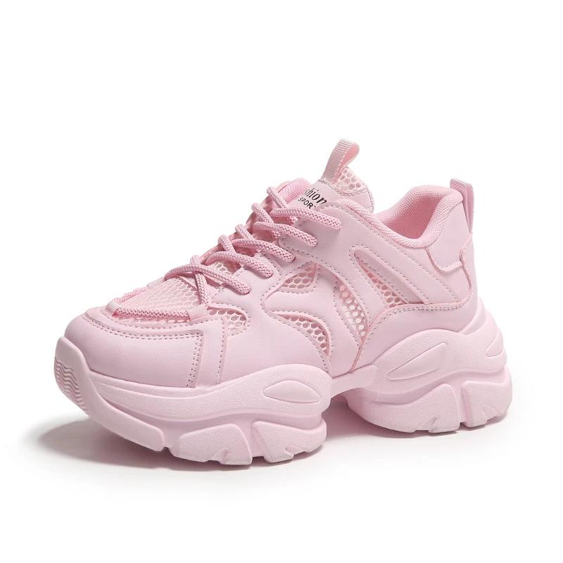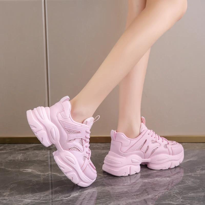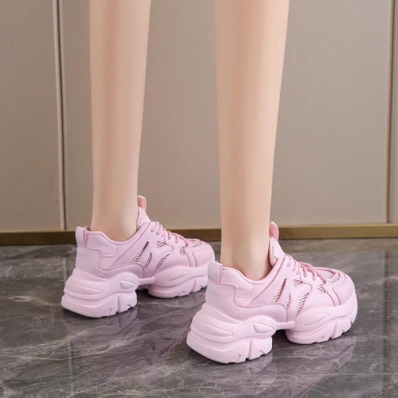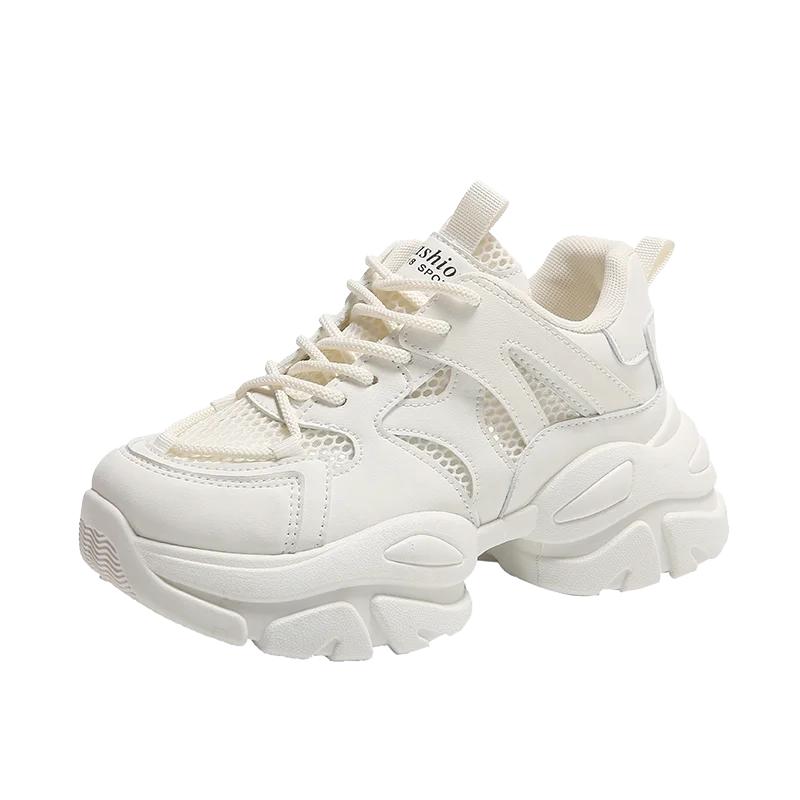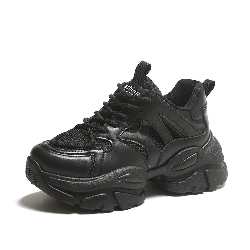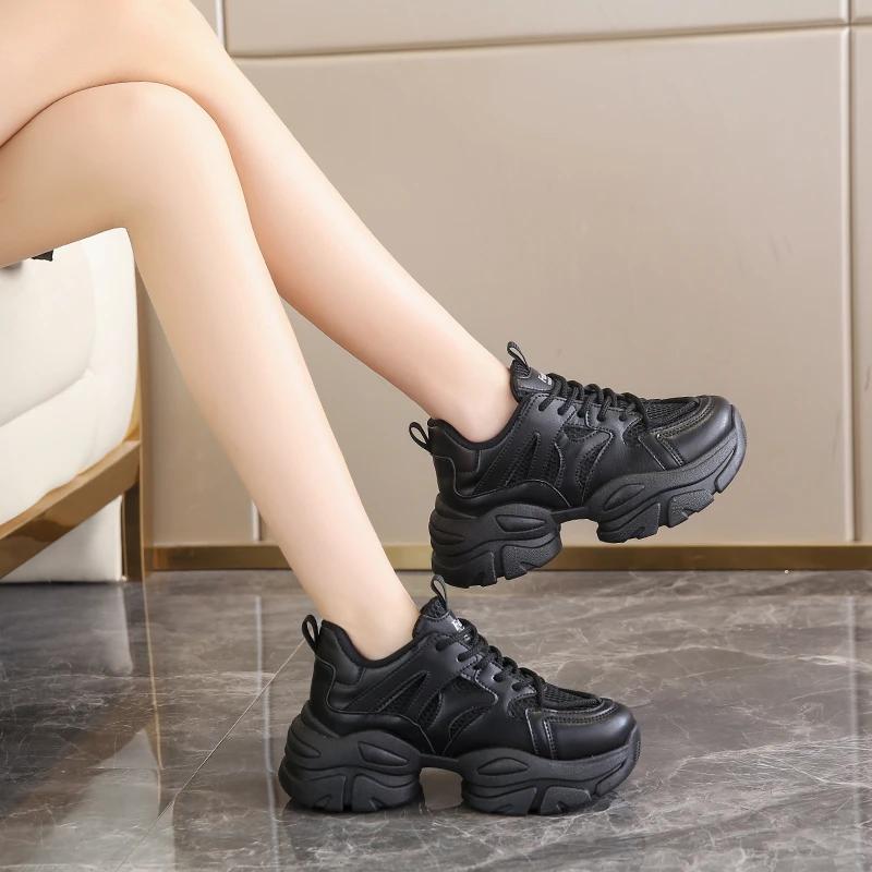 Мода Женские Новые Модные Кроссовки на Толстой Подошве 2024 Осень Повседневная Спортивная Обувь для Ходьбы Сетка Кожа Балетки Универсальная Женская Обувь