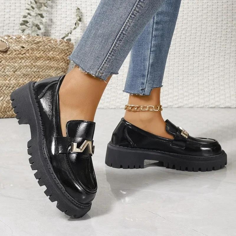 Модная обувь для женщин Весна Новые лоферы женские Толстая подошва Slip on Flats Кожаная платформа Повседневная пряжка Туфли женские Zapatos De Mujer