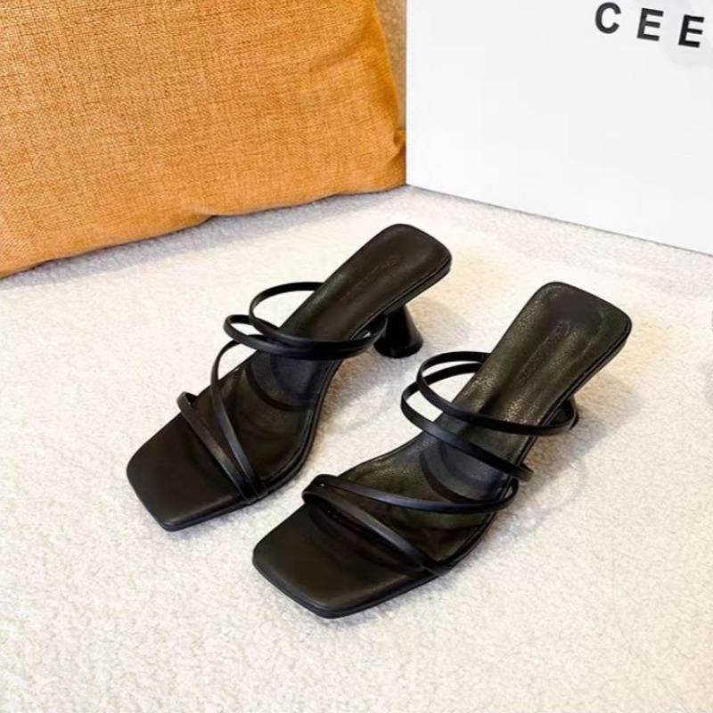 Мода 2024 Лето Новые женские тапочки на высоком каблуке Модные квадратные носки Grace Narrow Band Solid Casual Daily Slippers