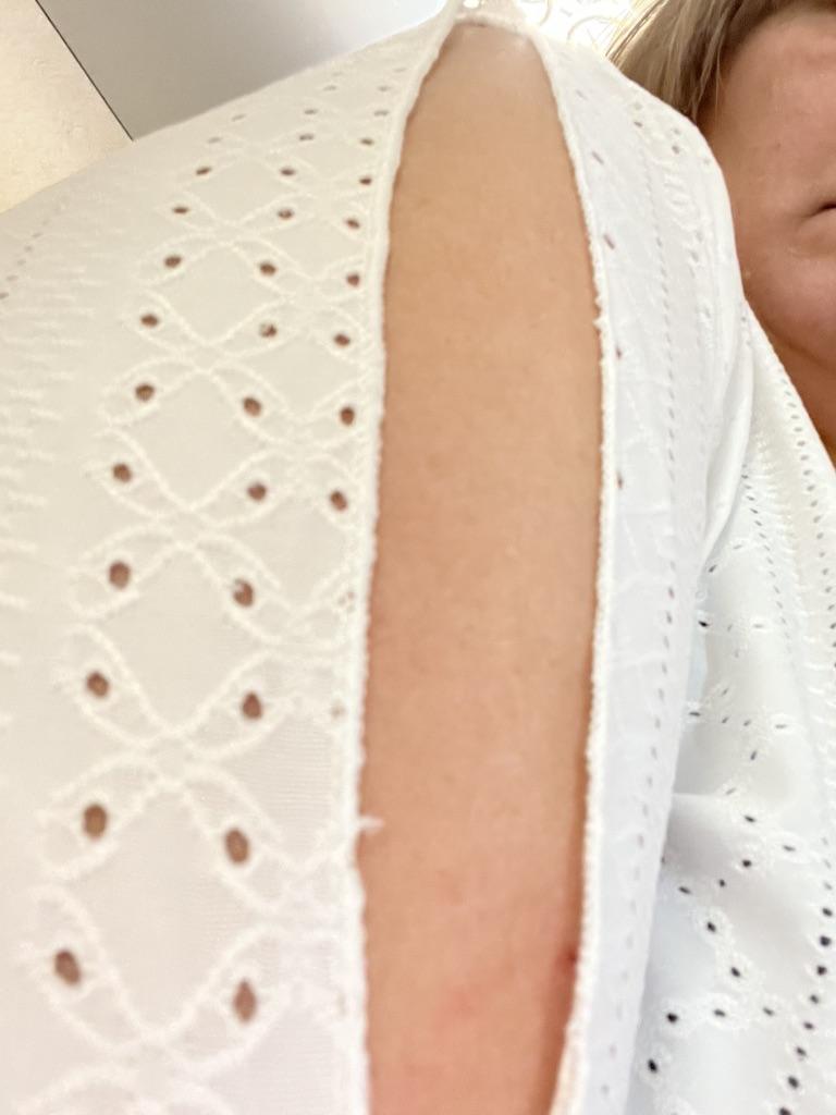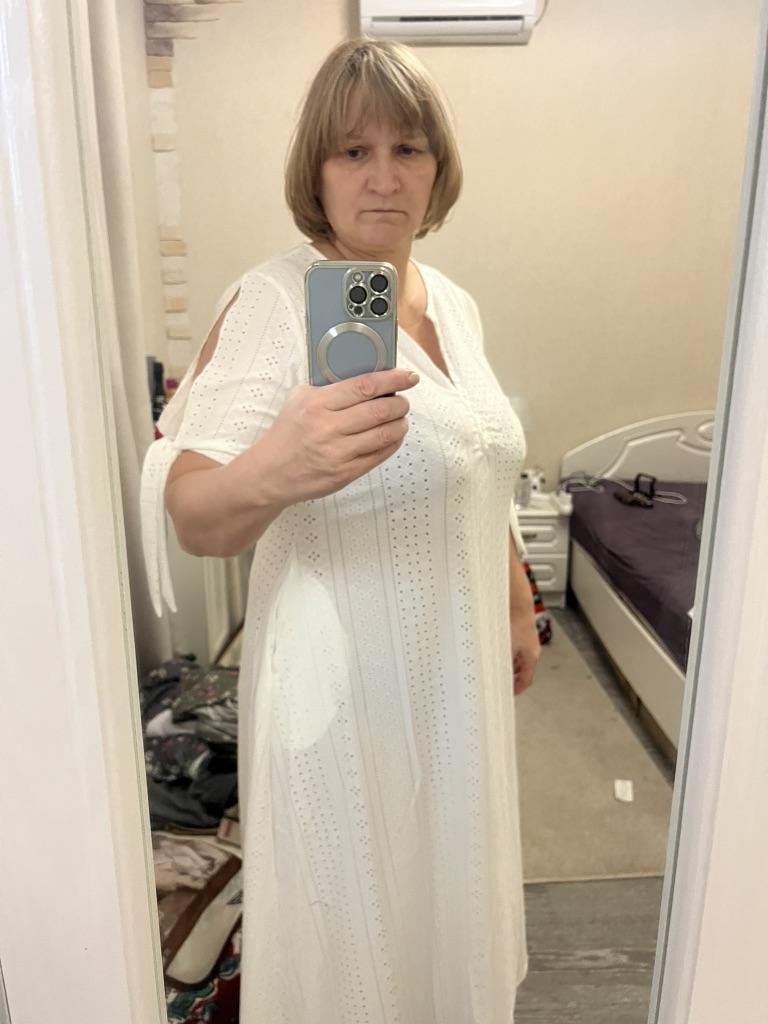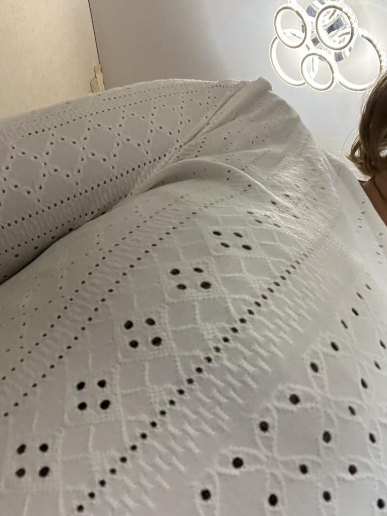 Ткань неплохая в мелкую дырочку. Жарко не будет. Смущает пошив сверху. Думаю немного перешить.