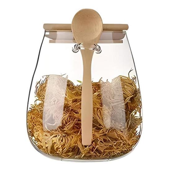 Банка оснащена крышкой из бамбукового дерева с силиконовым кольцом для надежной герметизации.. Такая конструкция предотвращает попадание пыли и влаги, а механизм открывания и закрывания одной рукой добавляет практичности и функциональности.