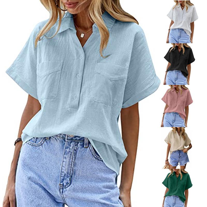 Женская однотонная рубашка-пуловер с короткими рукавами и двумя карманами, свободная рубашка из хлопка и льна, блузки и рубашки — купить товар онлайн с бесплатной доставкой до всему миру!