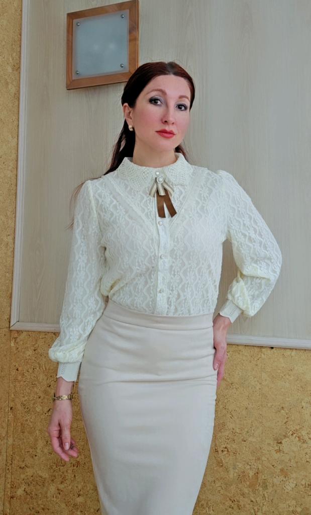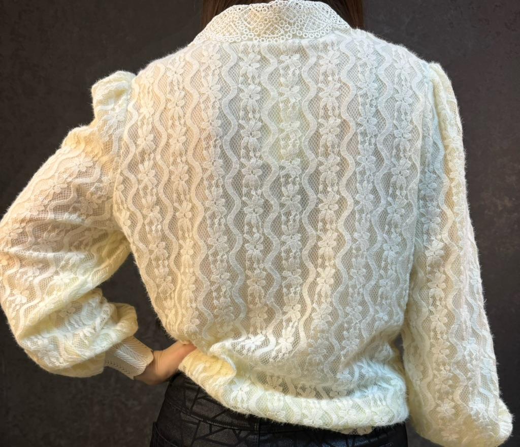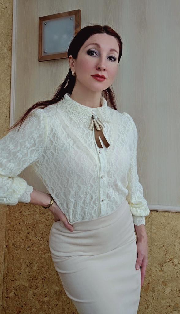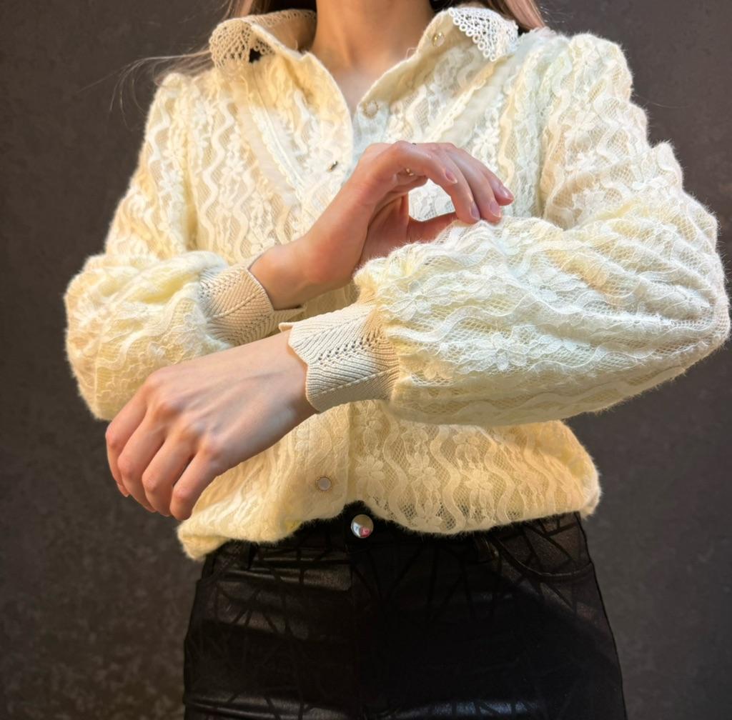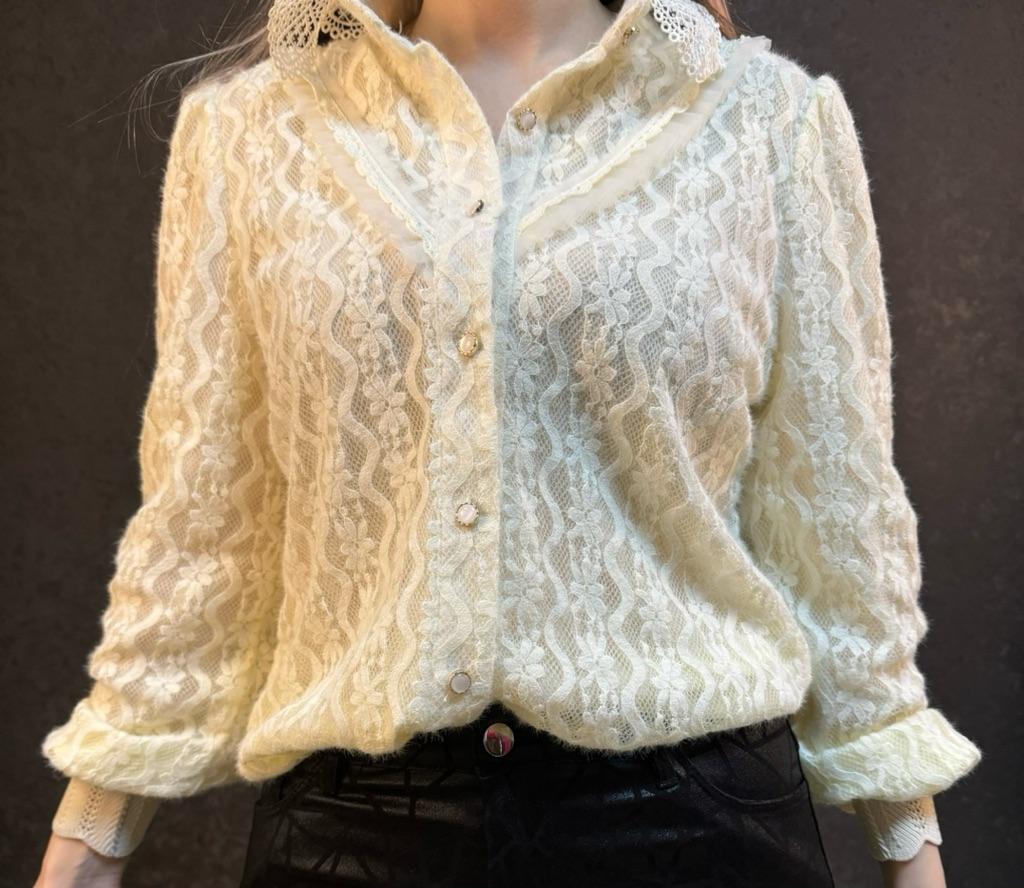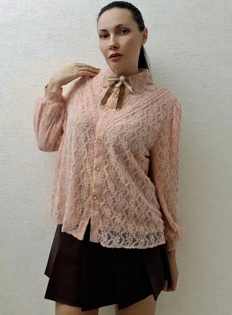 Кружевная блуза в ретро стиле. Нереальная😍 нетривиальная, элегантная и очень женственная. Такая блуза рисковала смотреться дёшево с другим кружевом, но все материалы подобраны идеально, и результат точно притянет все взгляды! Эта квинтэссенция элегантности состоит из нескольких слоёв хлопкового кружева разной плотности и рисунка, умело подобранных и сшитых, мягкого подклада, аккуратных пуговок и брошки, которую можно пристегнуть и отстегнуть при желании. Отдельно выделены рукава, отложной воротник и треугольник на груди. Качество вещи прямо отличное во всём: начиная от материалов и заканчивая кроем и пошивом. Огромный размерный ряд, размерная сетка соответствует. На выбор 3 расцветки, у меня в молочном оттенке.