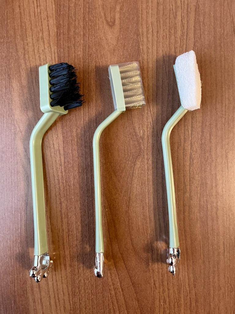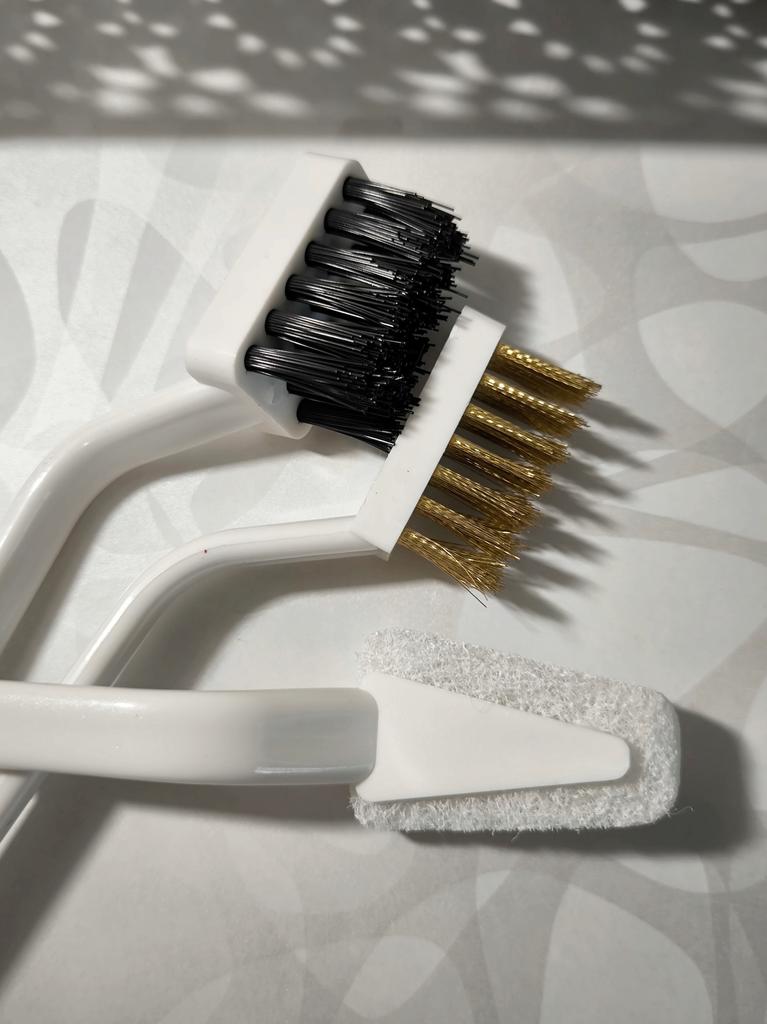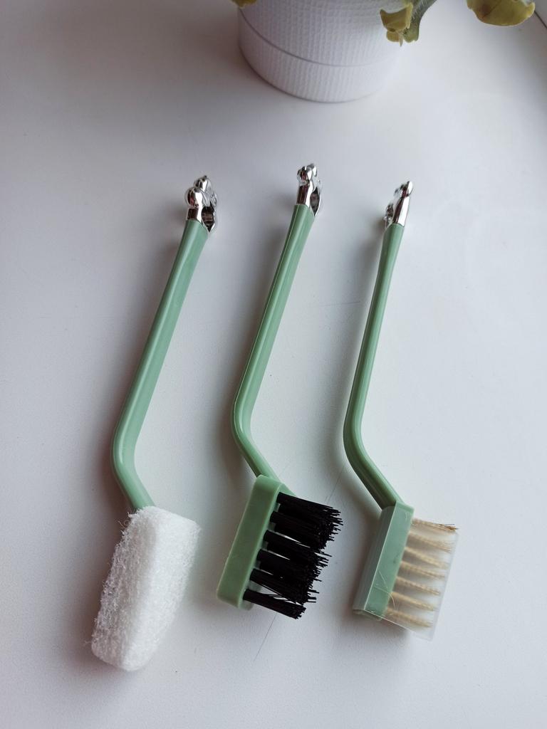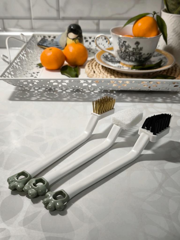 Набор щеток для чистки поверхностей В комплекте 3 щетки: • с металлическими щетинками • с абразивной губкой • с нейлоновыми щетинками Поможет справиться с различными загрязнениями Имеют компактный размер ( длина 18,5 см) и изогнутые ручки. Их удобно держать в руках и чистить ними. Милый дизайн. Качество хорошее. Пластик без запаха. Только щёточка с абразивной губкой, не очень практичная, и долго не прослужит. Но, тем не менее, я покупкой довольна. И рекомендую 🤗