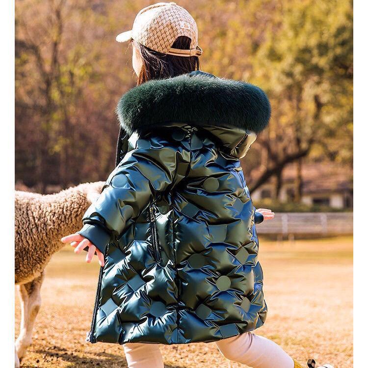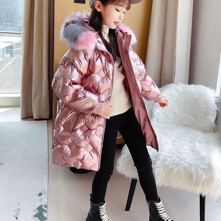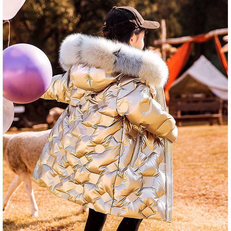 Зимняя мода No-Clean Белый утиный пух Детское длинное пальто Теплый меховой воротник для девочек Зимние куртки Детская верхняя одежда