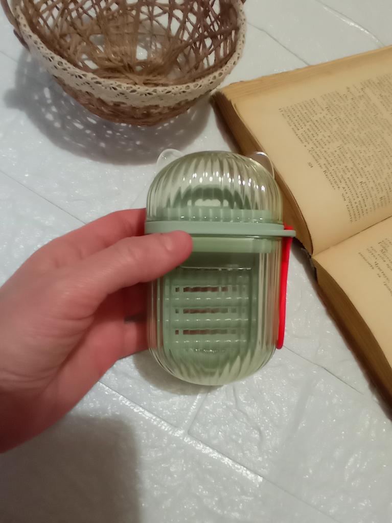 Портативная мыльница Качество отличное. Пластик крепкий, без постороннего запаха. Оснащенна силиконовым шнурком и поддоном с дренажными отверстиями. Имеет милый дизайн. Размер 11,4*7,5*4,5 см. Крышечка держится плотно. Твердая пятерка и моя уверенная рекомендация 🤗