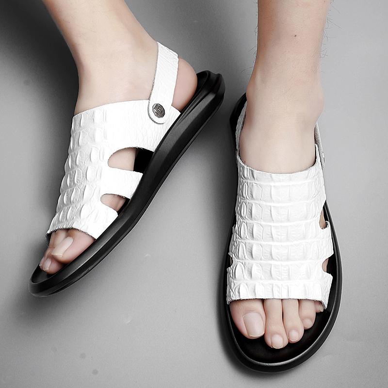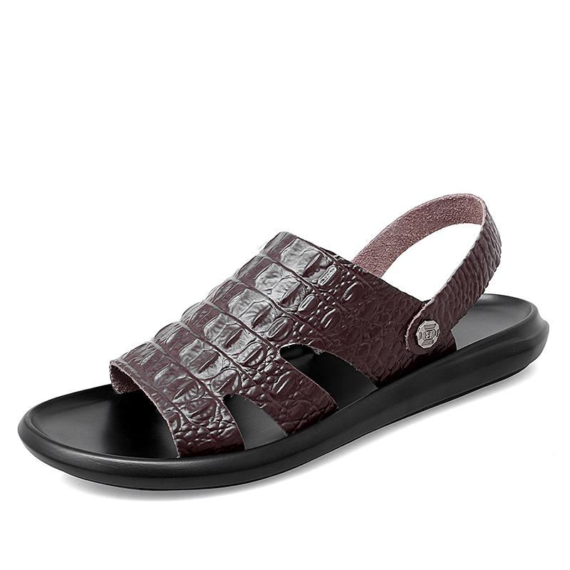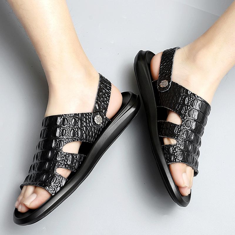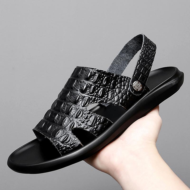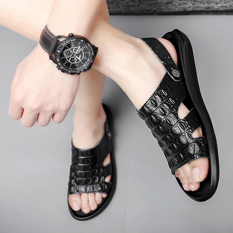 Модная летняя пляжная обувь, сандалии из крокодиловой кожи, высококачественные кожаные нескользящие мужские тапочки, дышащие, двухразового использования, мужские сандалии, обувь