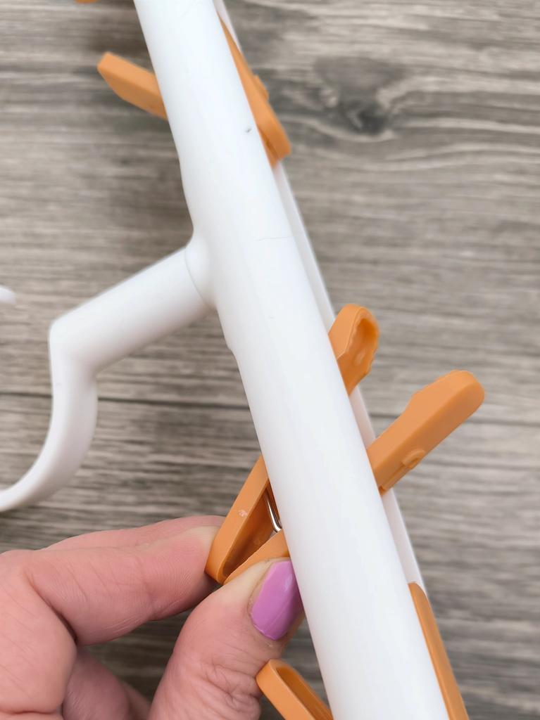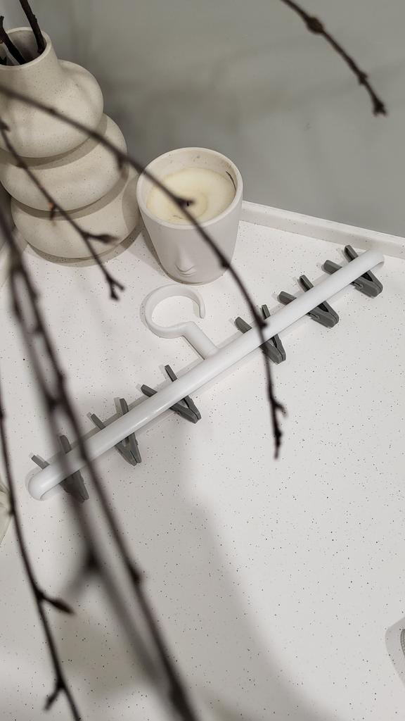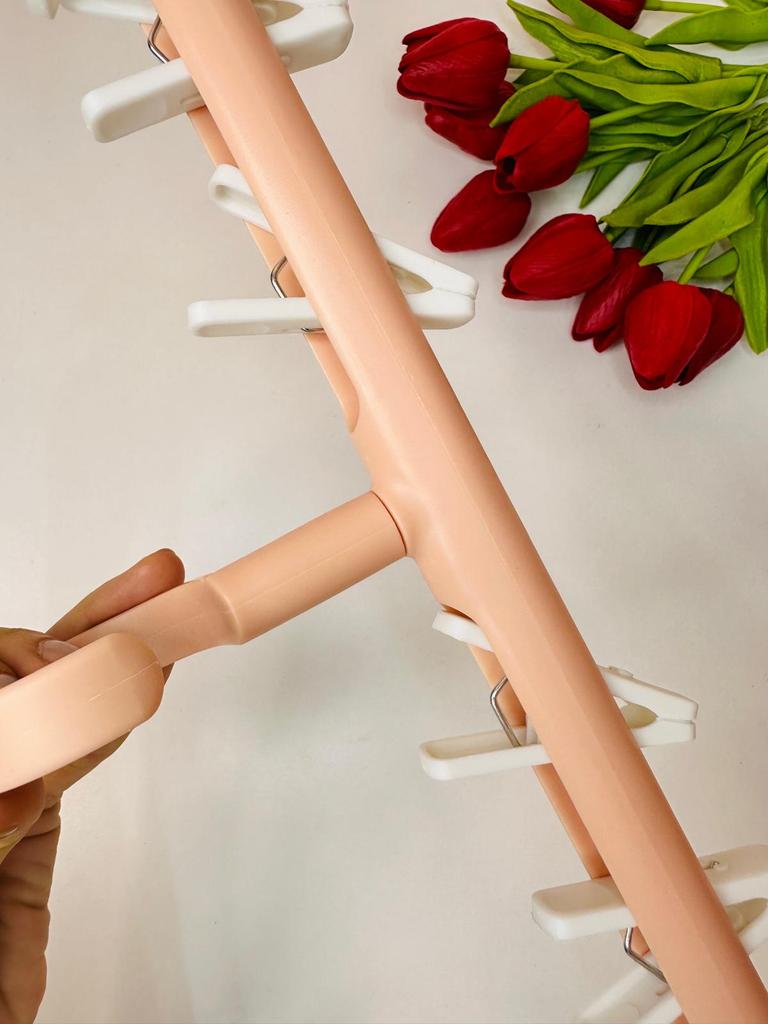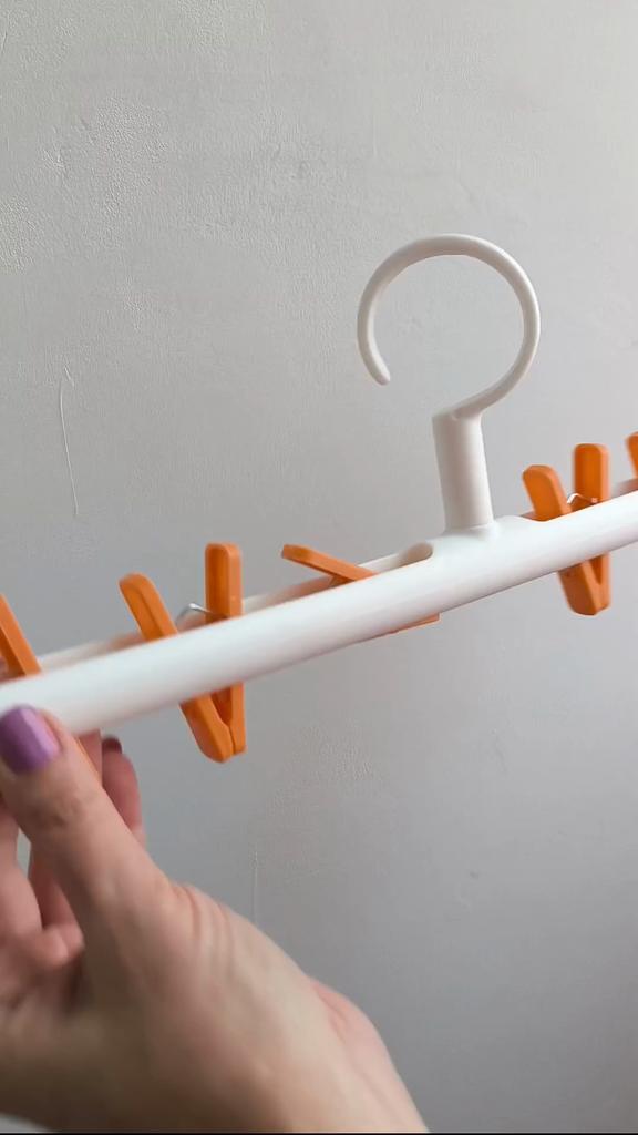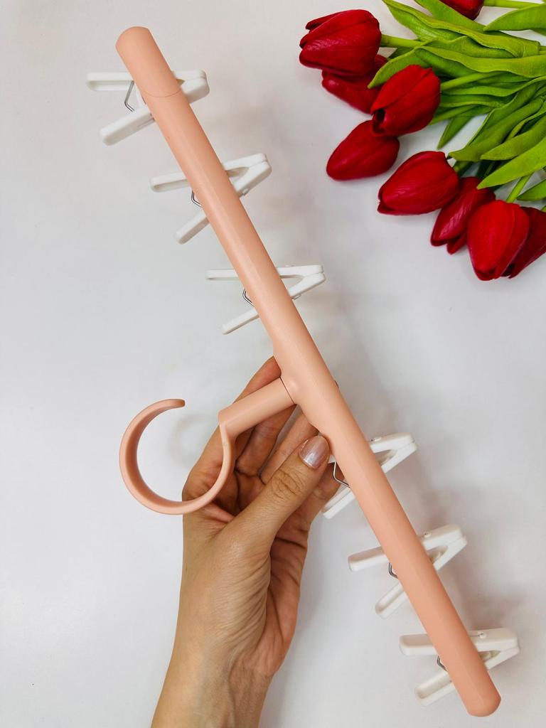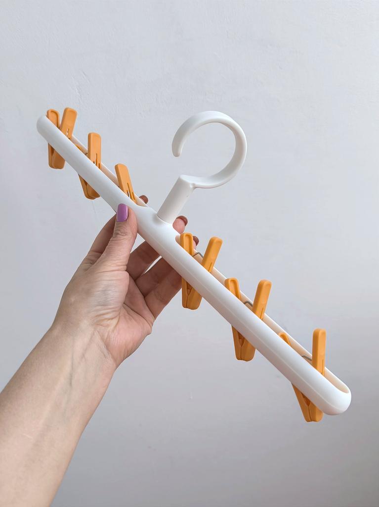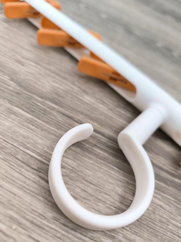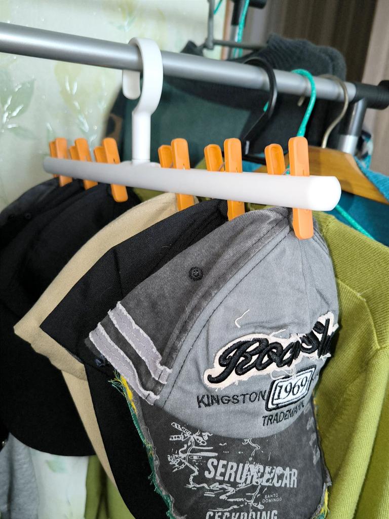 Прикольная вещь. То, что нужно для хранения шапок, кепок, и даже сумок, шарфов. Благодаря вращающийся ручке удобно повернуть, и прищепки тоже вращаются, что удобно в узком пространстве шкафа, чтобы вынуть ту вещь, которая необходима. Вешалка из пластика.