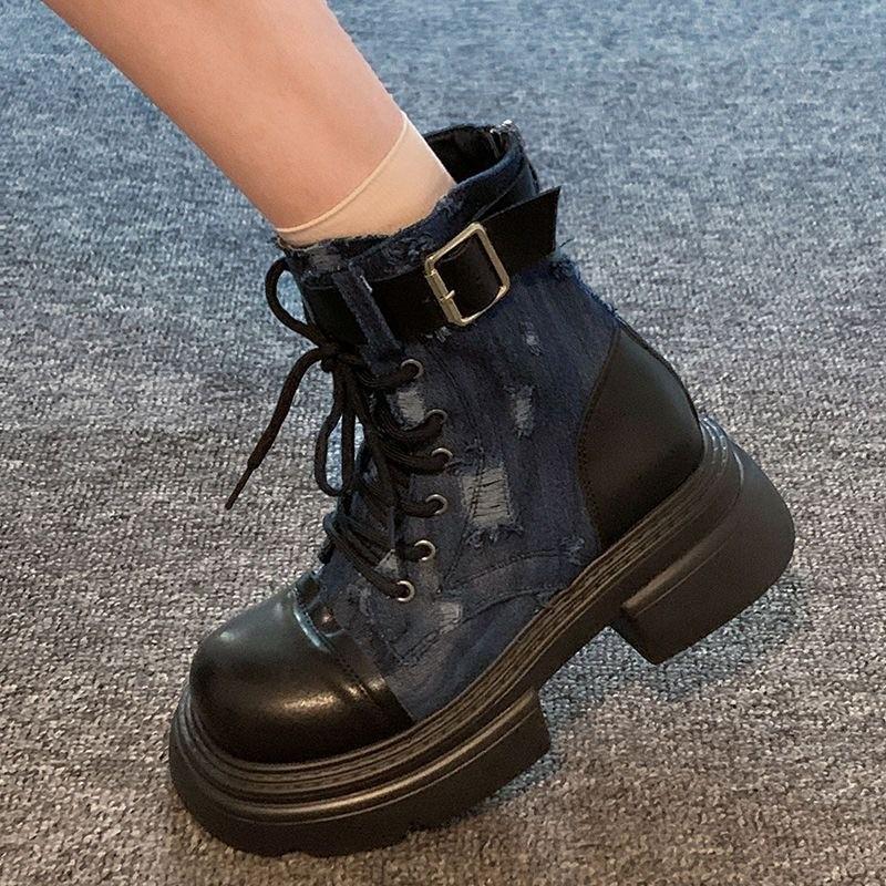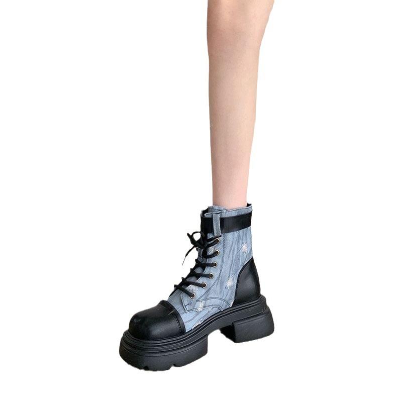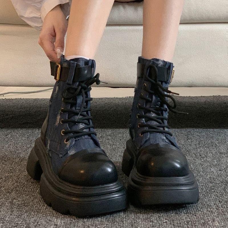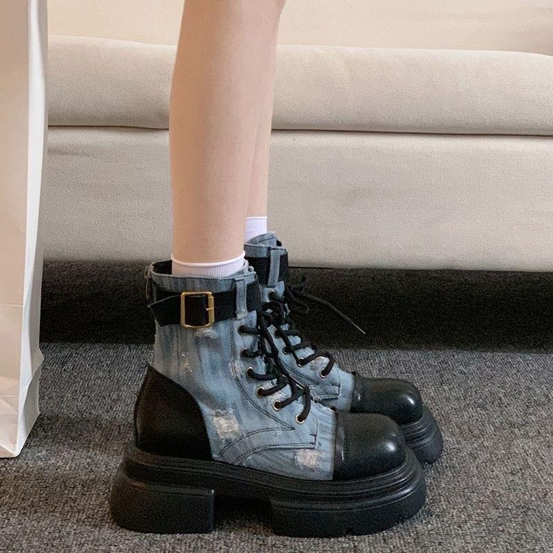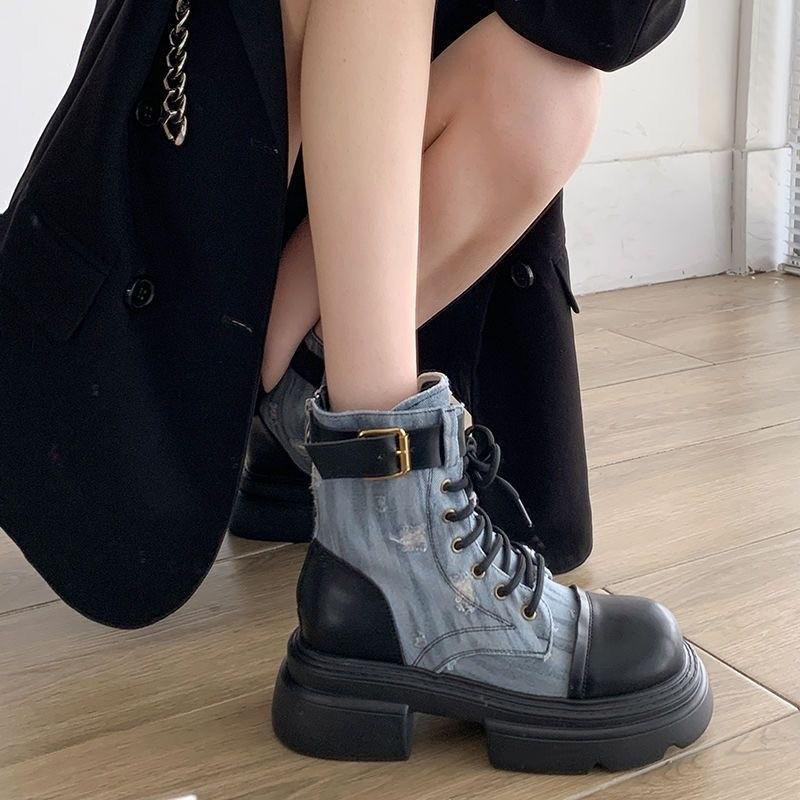 Модные рабочие ботинки в британском стиле для женщин на осень 2024 года, новые суперпопулярные джинсовые короткие ботинки с толстой подошвой и толстым каблуком