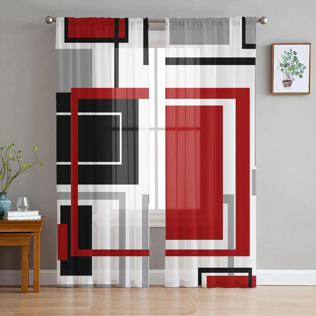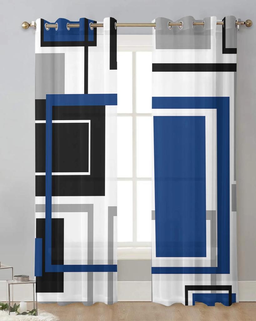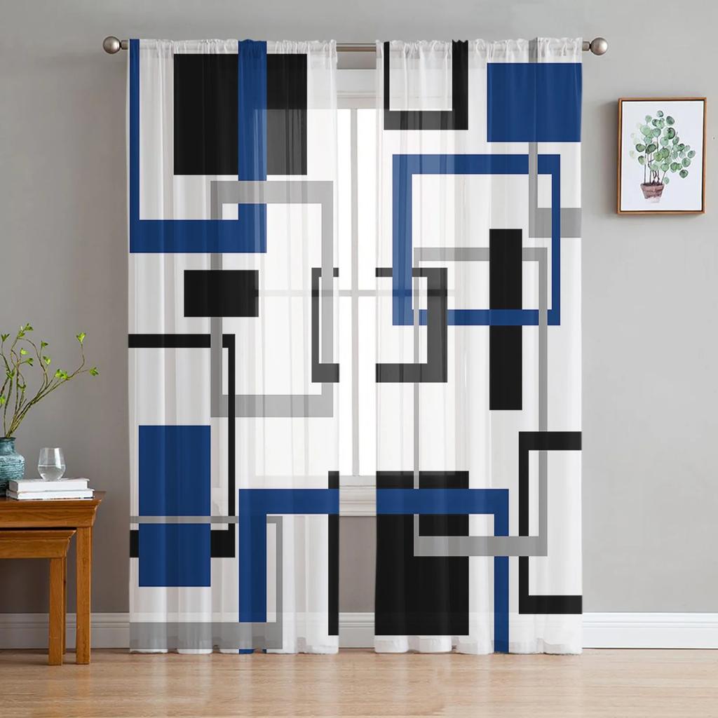 Abstract Geometry Squares Modern Art Blue Tulle Curtains Living Room Kitchen Window Decoration Chiffon Voile Sheer Curtain