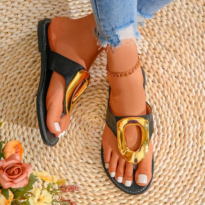 Мода 2024 года, модная женская обувь, женские тапочки с открытым носком, горячая распродажа, пляжные тапочки с металлическим декором, женские новые тапочки на плоской подошве больших размеров