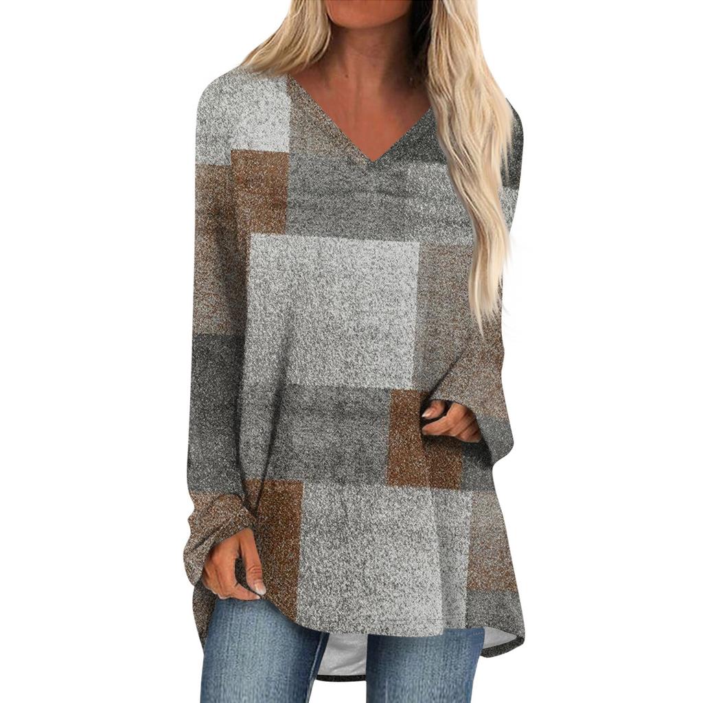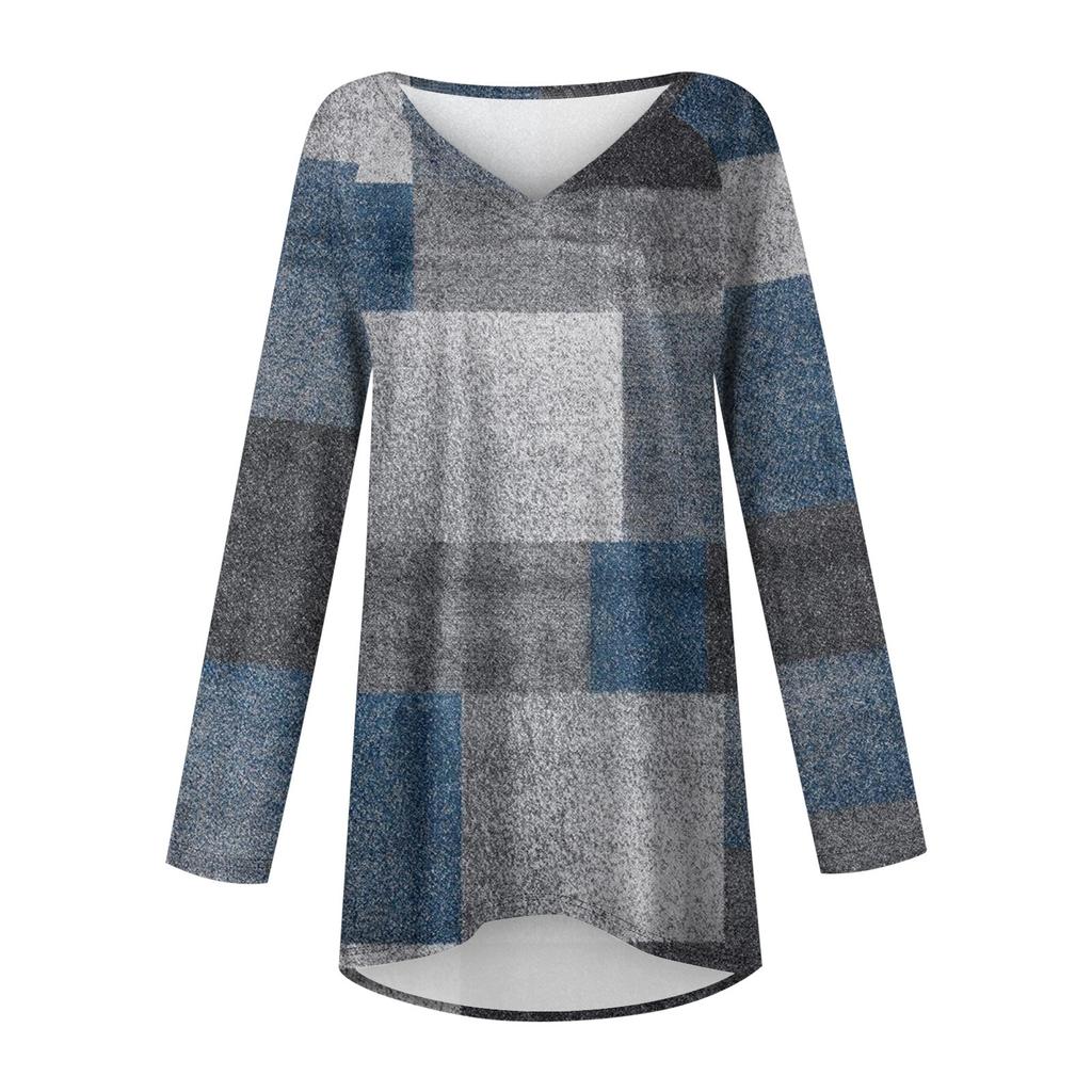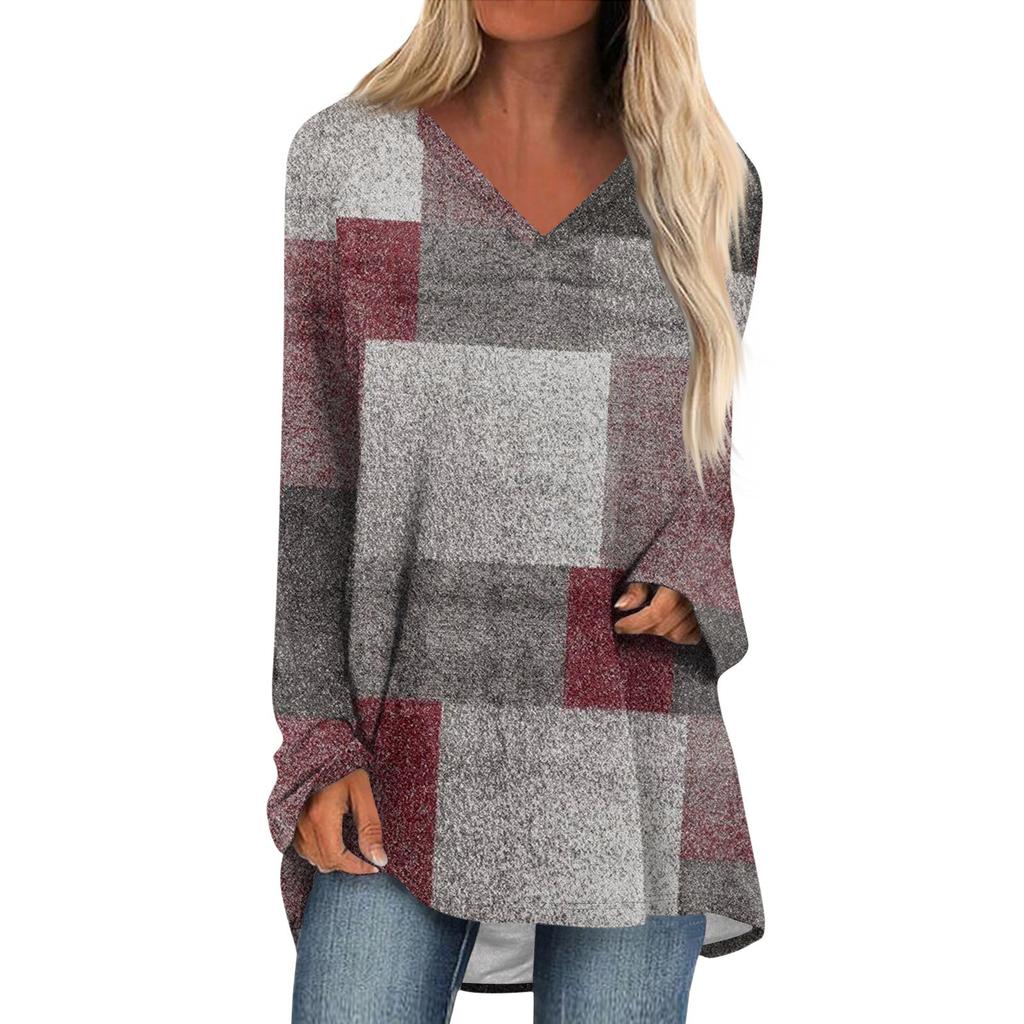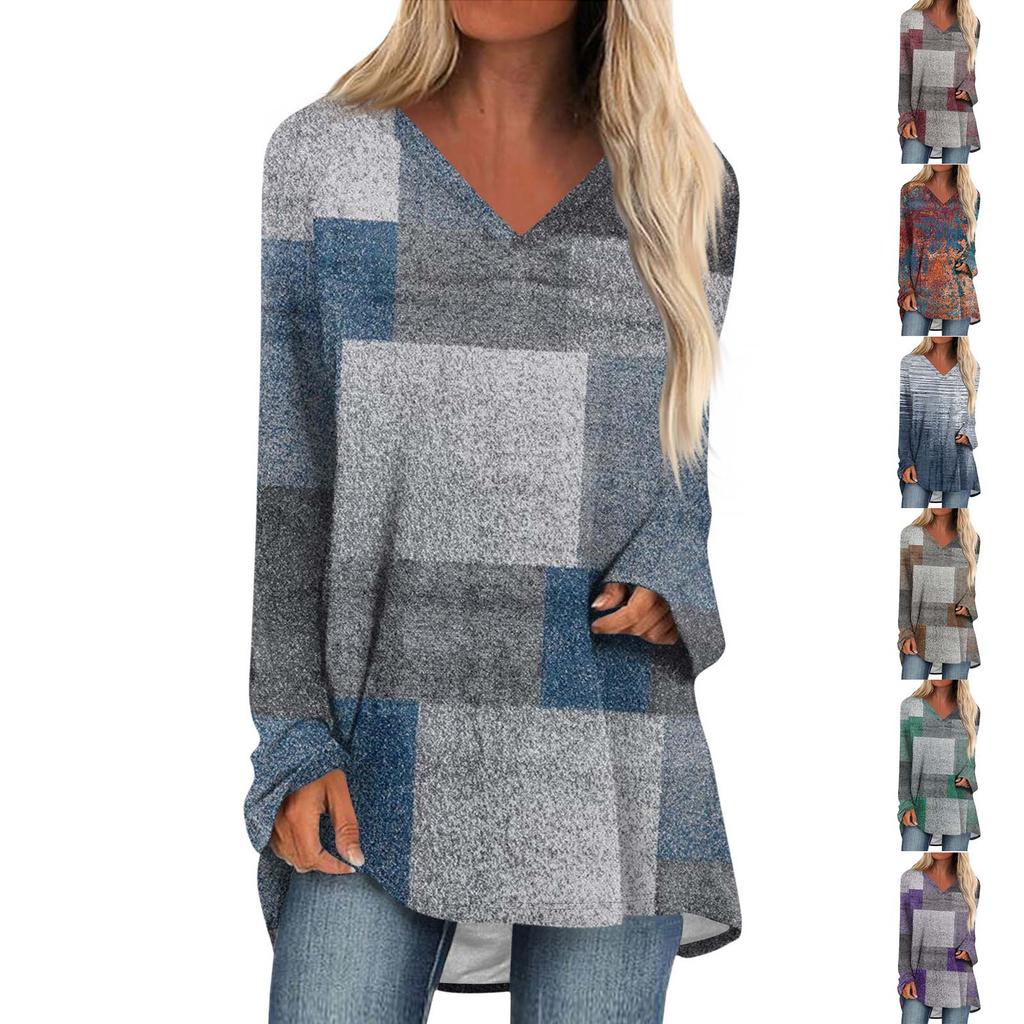 Женская и зимняя футболка с длинными рукавами и V-образным вырезом с принтом, повседневная, длинная, свободная