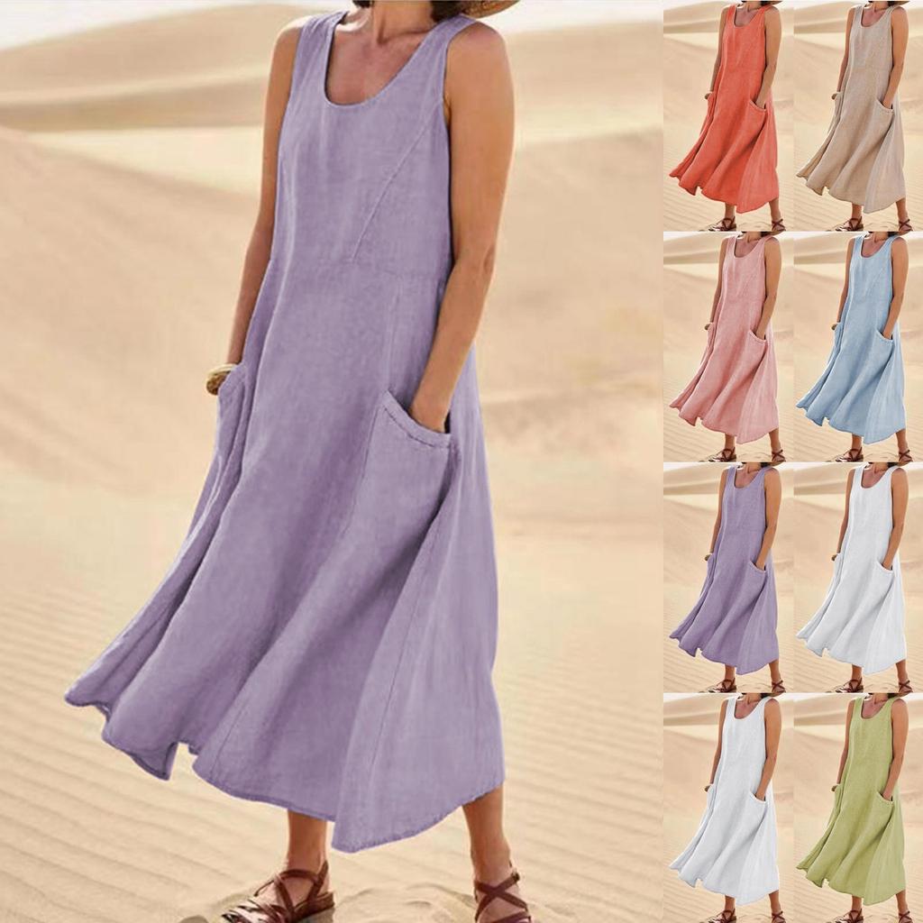 Женское модное повседневное однотонное хлопковое льняное платье без рукавов с карманами