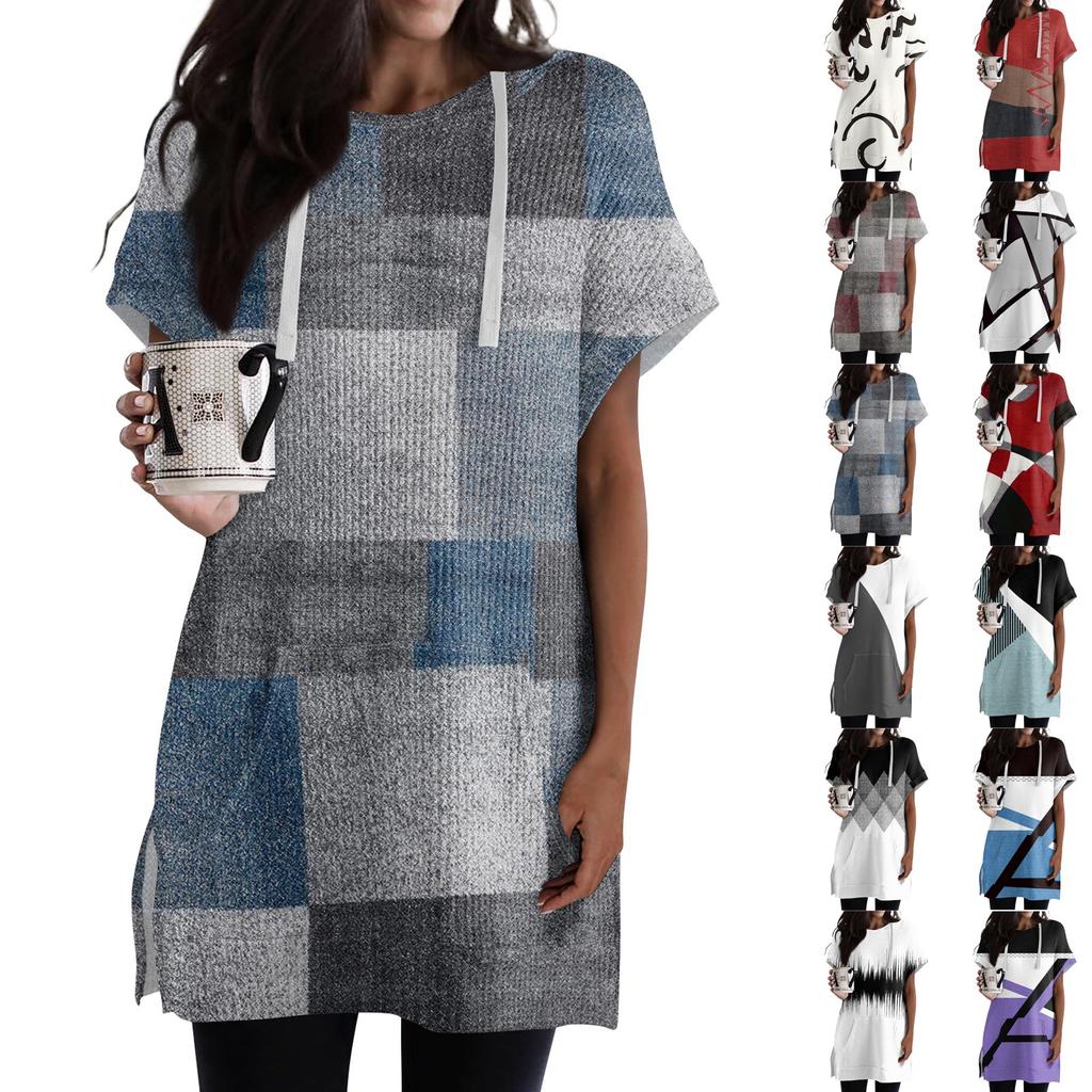 Женские свободные рубашки с принтом, толстовки с короткими рукавами и шнурком, вязаная туника с боковыми разрезами, топы с капюшоном и карманом