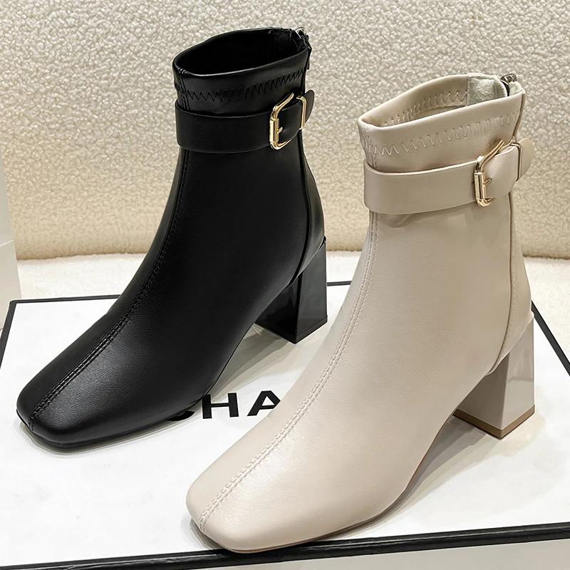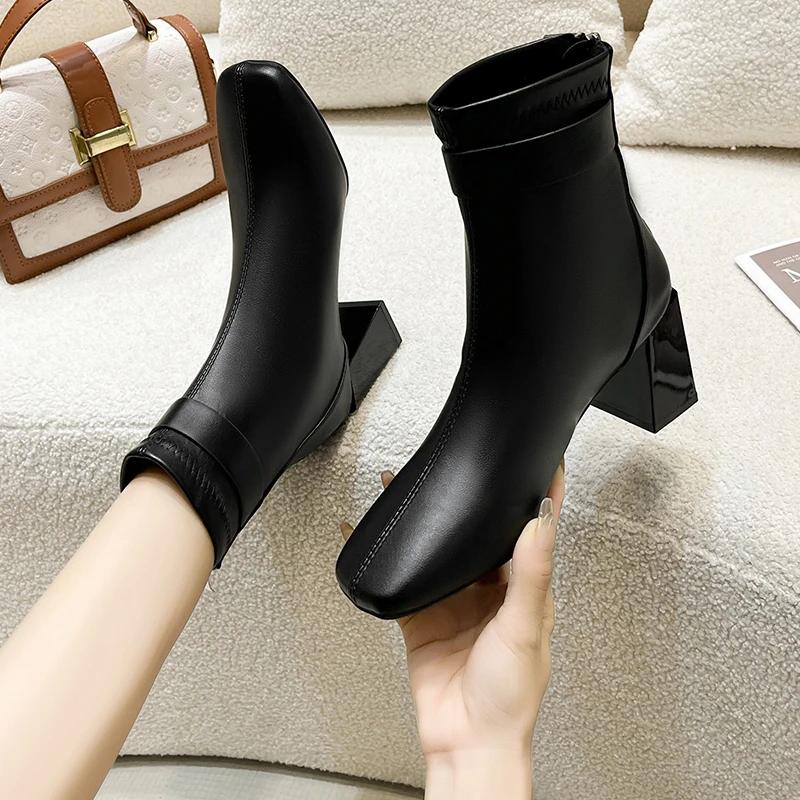 Мода 2024 года, хит продаж, однотонные универсальные зимние женские ботильоны с квадратным носком на молнии, женские элегантные короткие сапоги на толстом высоком каблуке