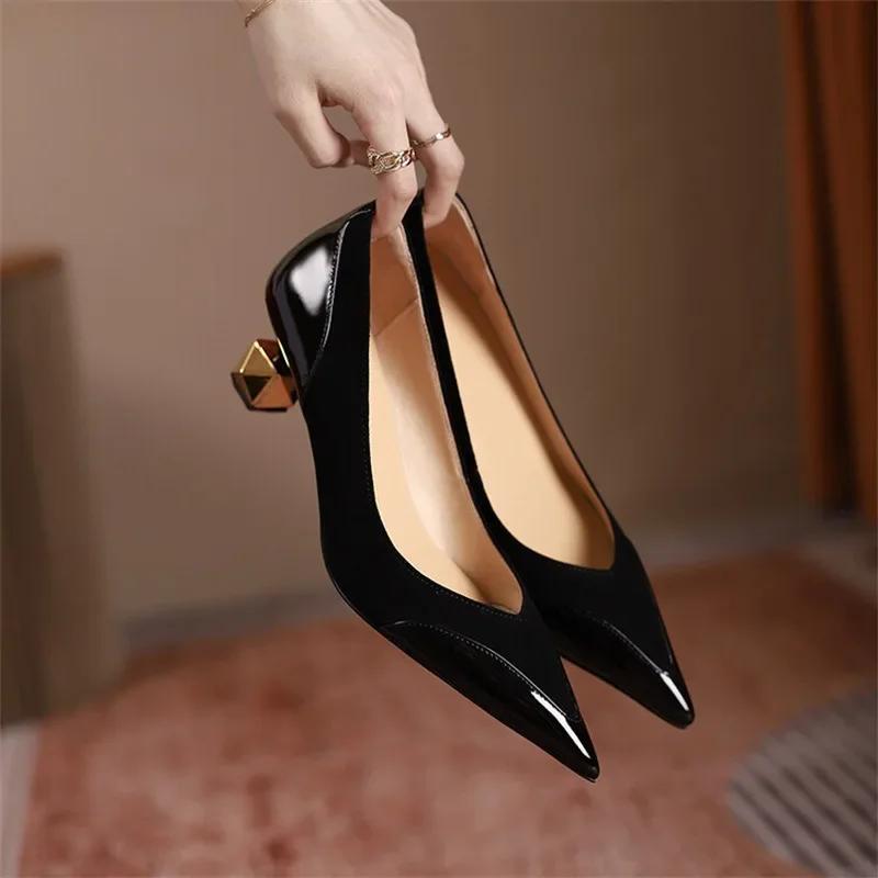 Модные туфли на среднем каблуке с высоким каблуком для женщин 2024 года, весна-осень, корейская мода, сращивание, заостренный неглубокий каблук, толстые одинарные туфли для женщин — купить товар онлайн с бесплатной доставкой по всему миру!