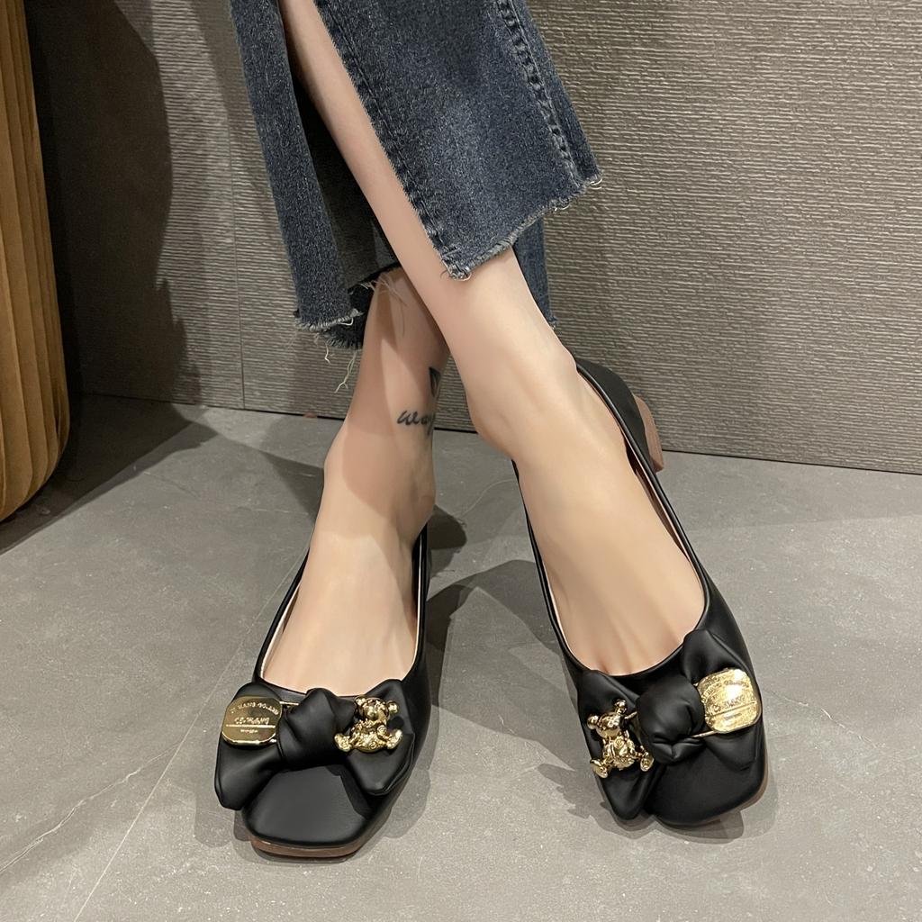 Модные женские туфли Square Head 2024 Весна Осень Низкий каблук Металлические дизайнерские женские туфли Модные повседневные лоферы с бантом Женские