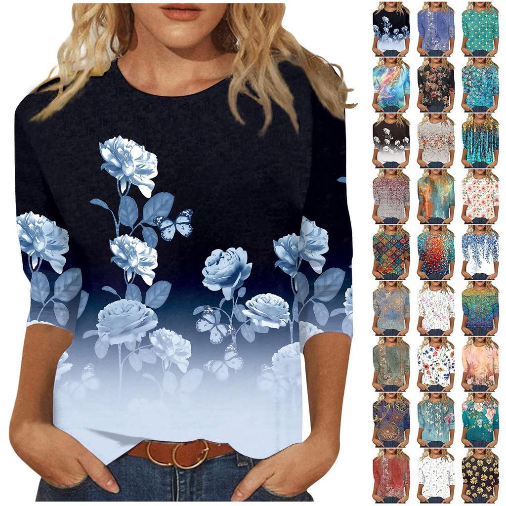 Женские топы с рукавом 3/4 и круглым вырезом Модные свободные милые рубашки Повседневные принты Модные блузки Футболки Летний пуловер