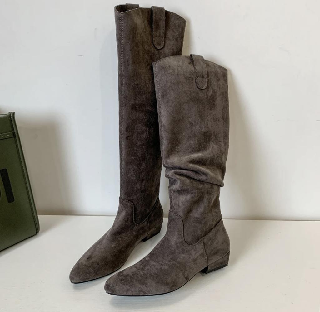 2024 Новый Стиль Кучи Сапог Заостренный Носок Квадратный Каблук Замша Римский Стиль Коричневые Длинные Сапоги до Колена Женские Сапоги — купить товар онлайн с бесплатной доставкой по всему миру!