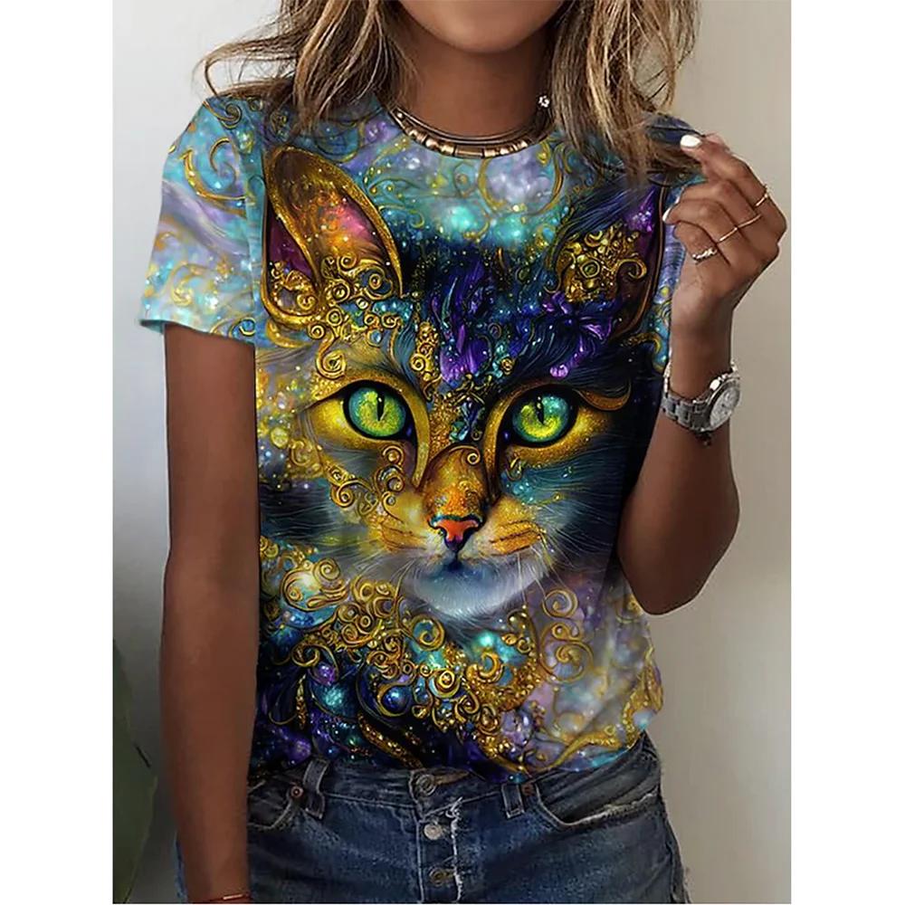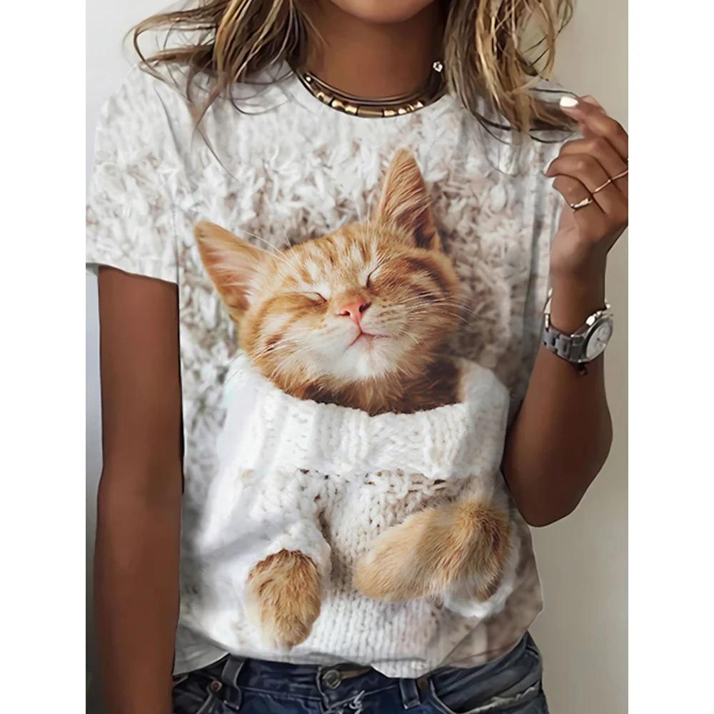 2024 Новая модная женская футболка с 3D принтом милого котенка, короткий рукав, Harajuku Animal Pattern, уличная футболка с коротким рукавом, свободная