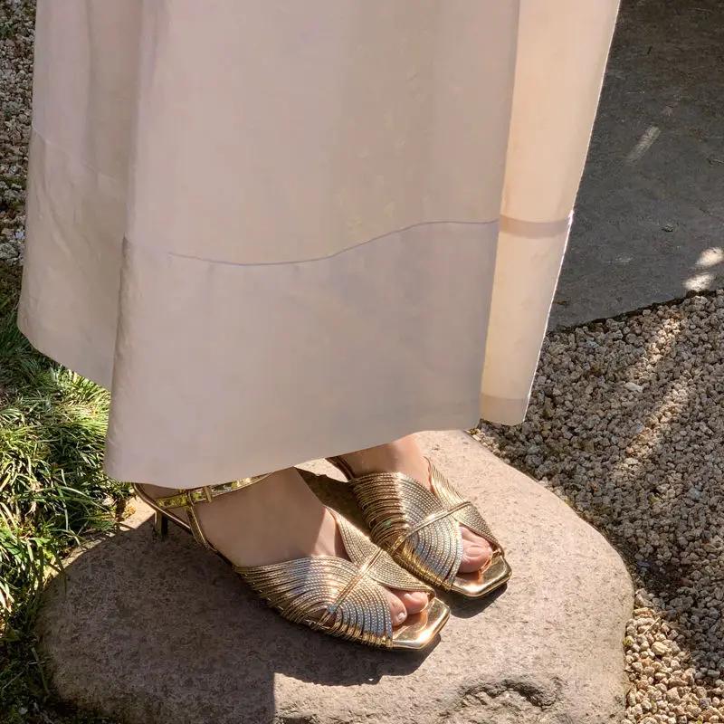 Золотые босоножки с пряжками для женщин, лето 2024 года, обувь, сексуальный открытый носок, средний каблук, женская обувь, удобная и элегантная обувь H