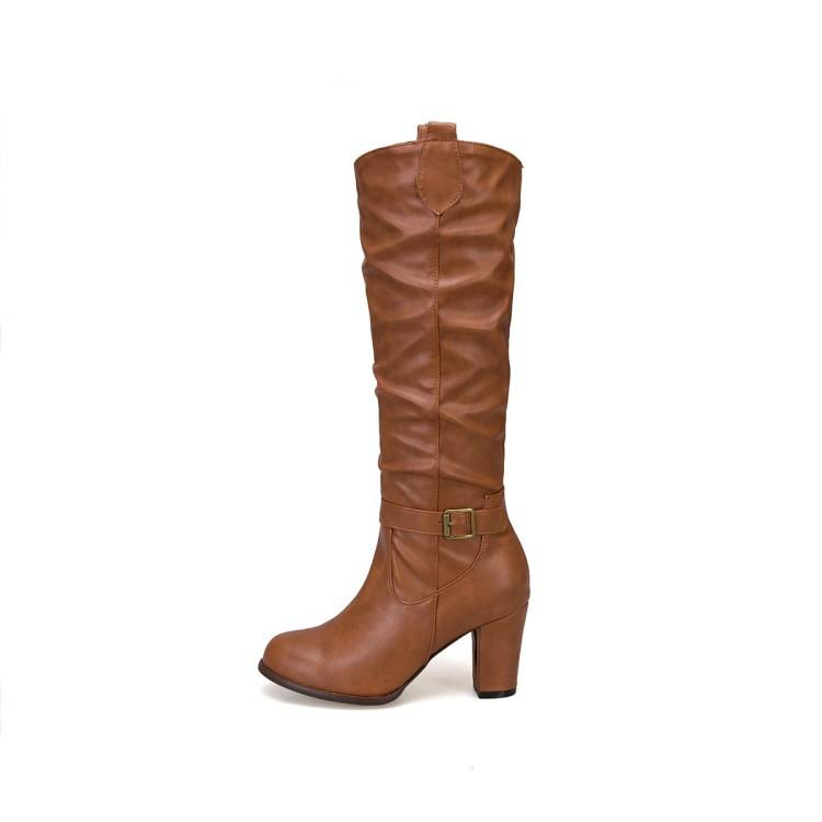 Модная обувь, большие размеры 34-43, высокие каблуки, женские черные туфли, женские, пряжка, плиссированные, из искусственной кожи, блочный каблук, длинные сапоги для верховой езды, женские
